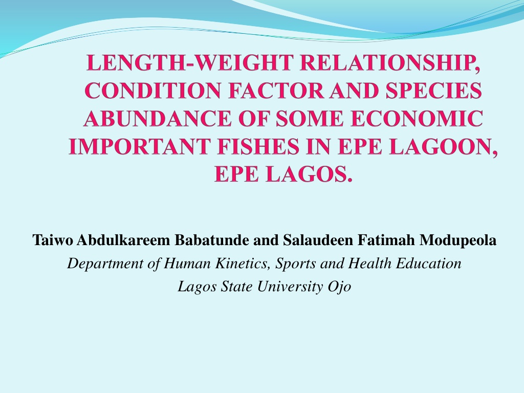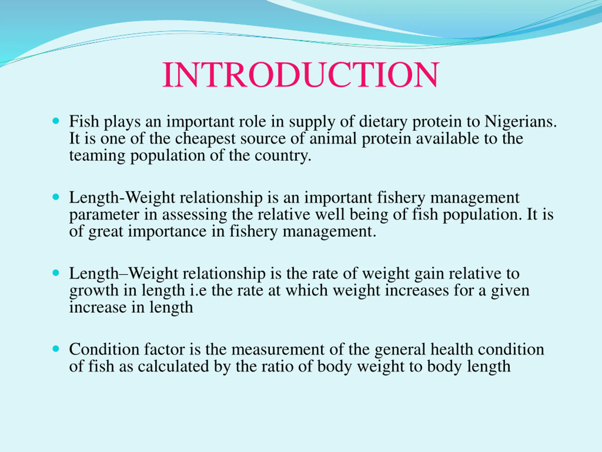 INTRODUCTION Fish plays an important role in supply of dietary protein to Nigerians. It is one of the cheapest source of animal protein available to the teaming population of the country. Length-Weight relationship is an important fishery management parameter in assessing the relative well being of fish population. It is of great importance in fishery management. Length Weight relationship is the rate of weight gain relative to growth in length i.e the rate at which weight increases for a given increase in length Condition factor is the measurement of the general health condition of fish as calculated by the ratio of body weight to body length