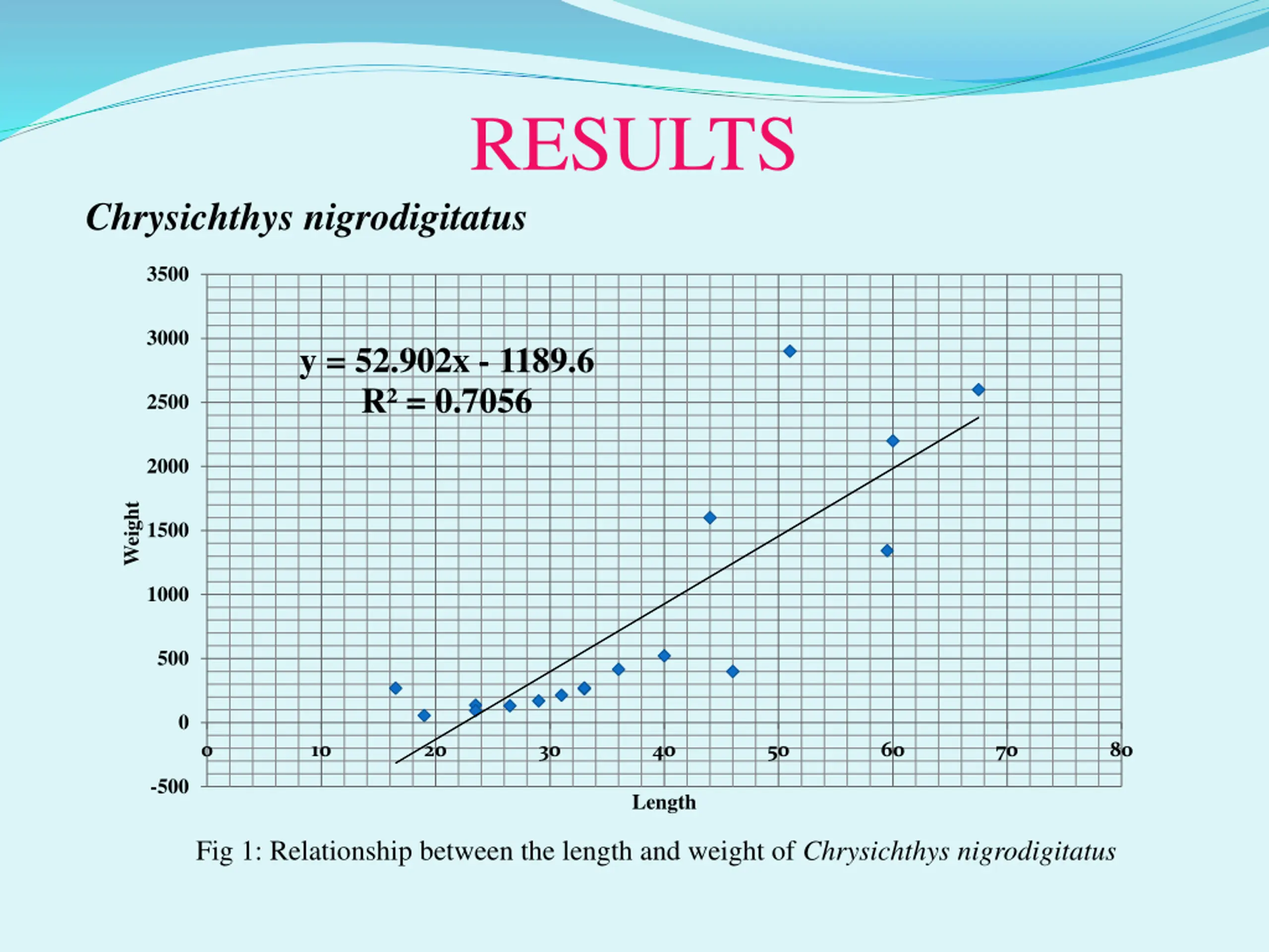 RESULTS Chrysichthys nigrodigitatus 3500 3000 y = 52.902x - 1189.6 R = 0.7056 2500 2000 Weight 1500 1000 500 0 0 10 20 30 40 50 60 70 80 -500 Length Fig 1: Relationship between the length and weight of Chrysichthys nigrodigitatus