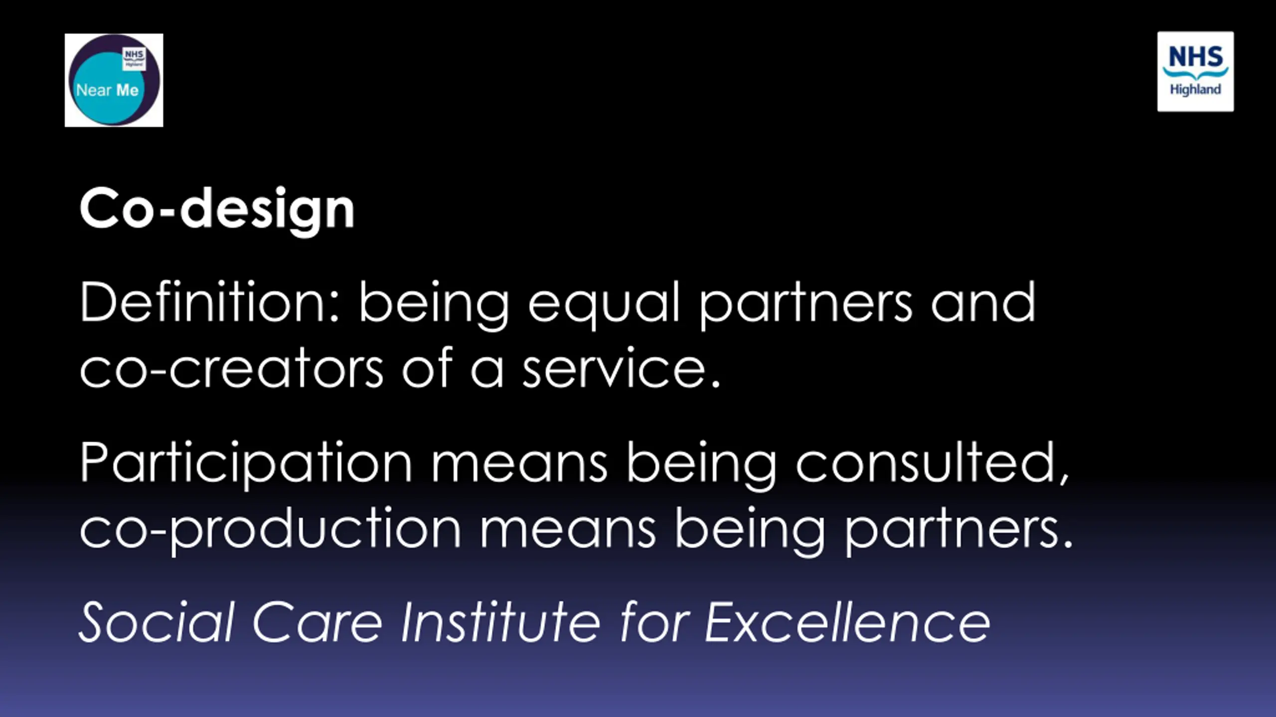 Co-design Definition: being equal partners and co-creators of a service. Participation means being consulted, co-production means being partners. Social Care Institute for Excellence