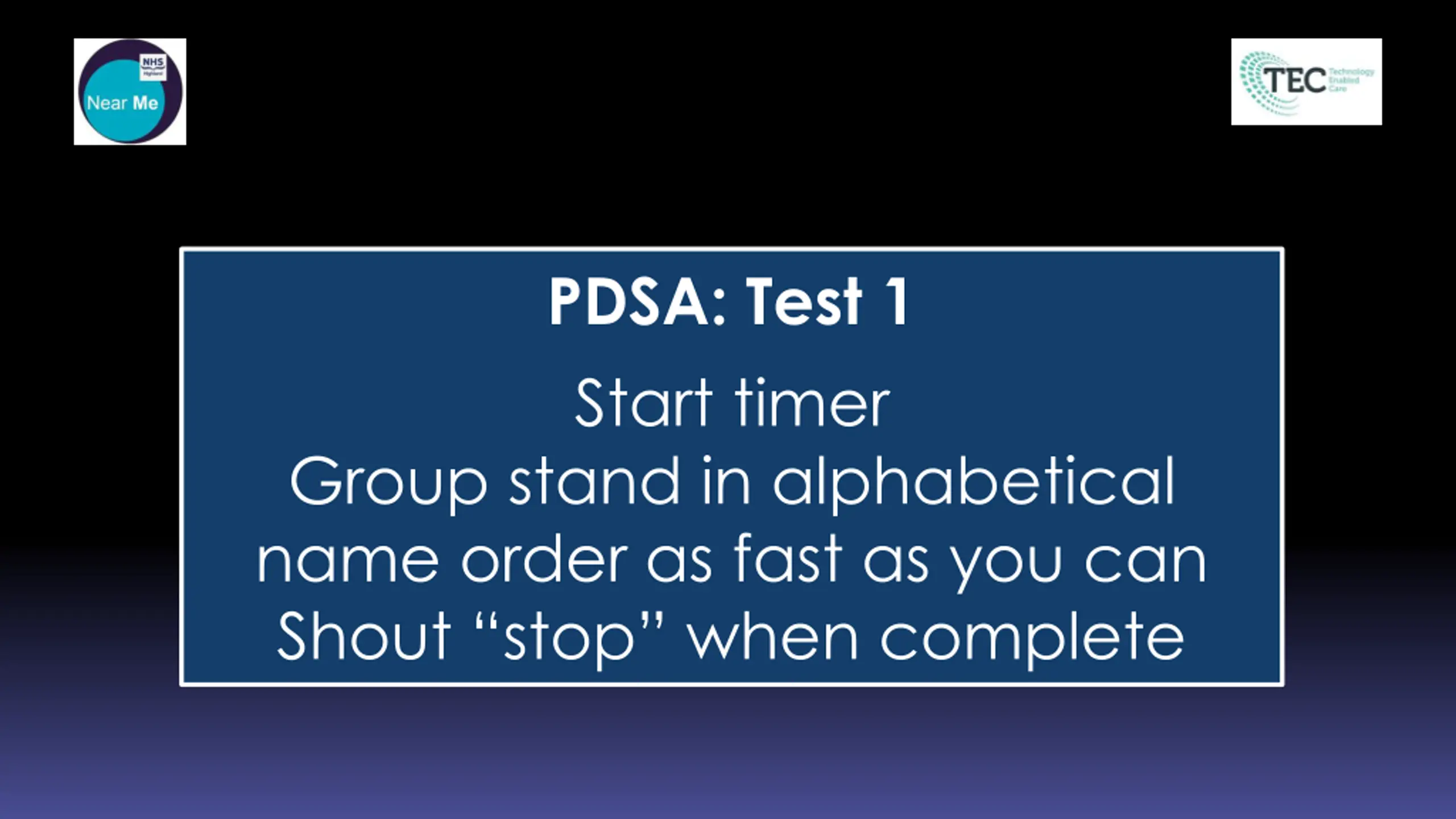 PDSA: Test 1 Start timer Group stand in alphabetical name order as fast as you can Shout stop when complete