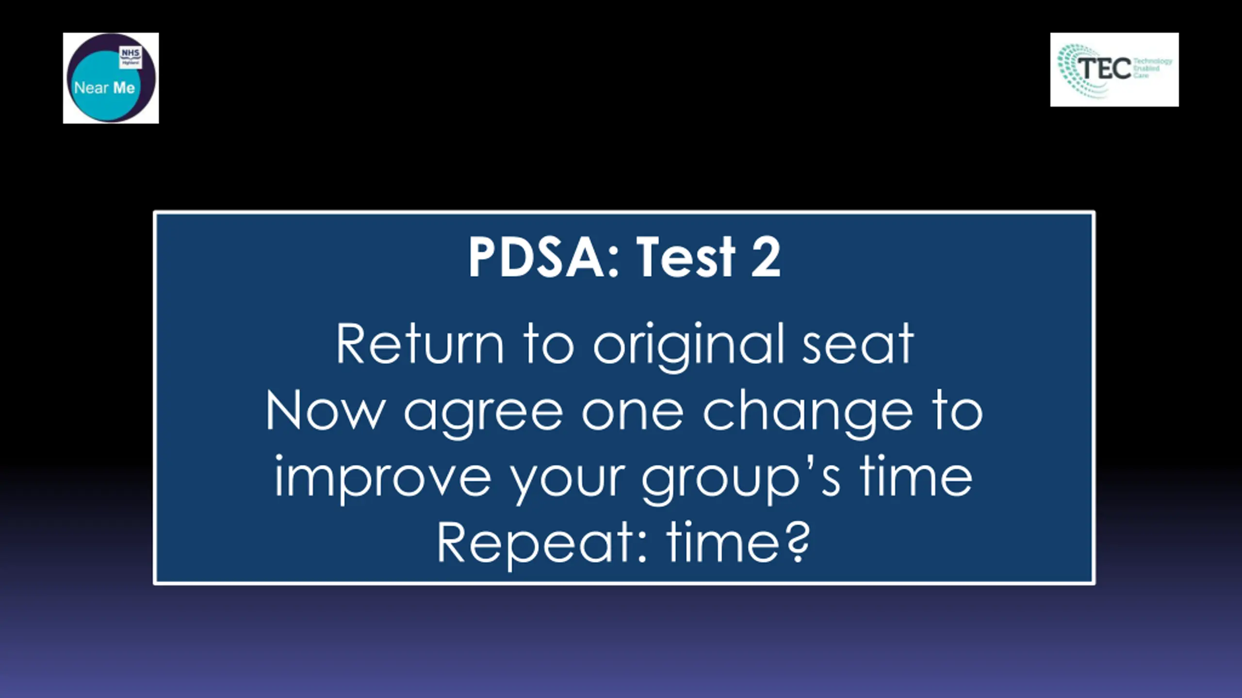 PDSA: Test 2 Return to original seat Now agree one change to improve your group s time Repeat: time?