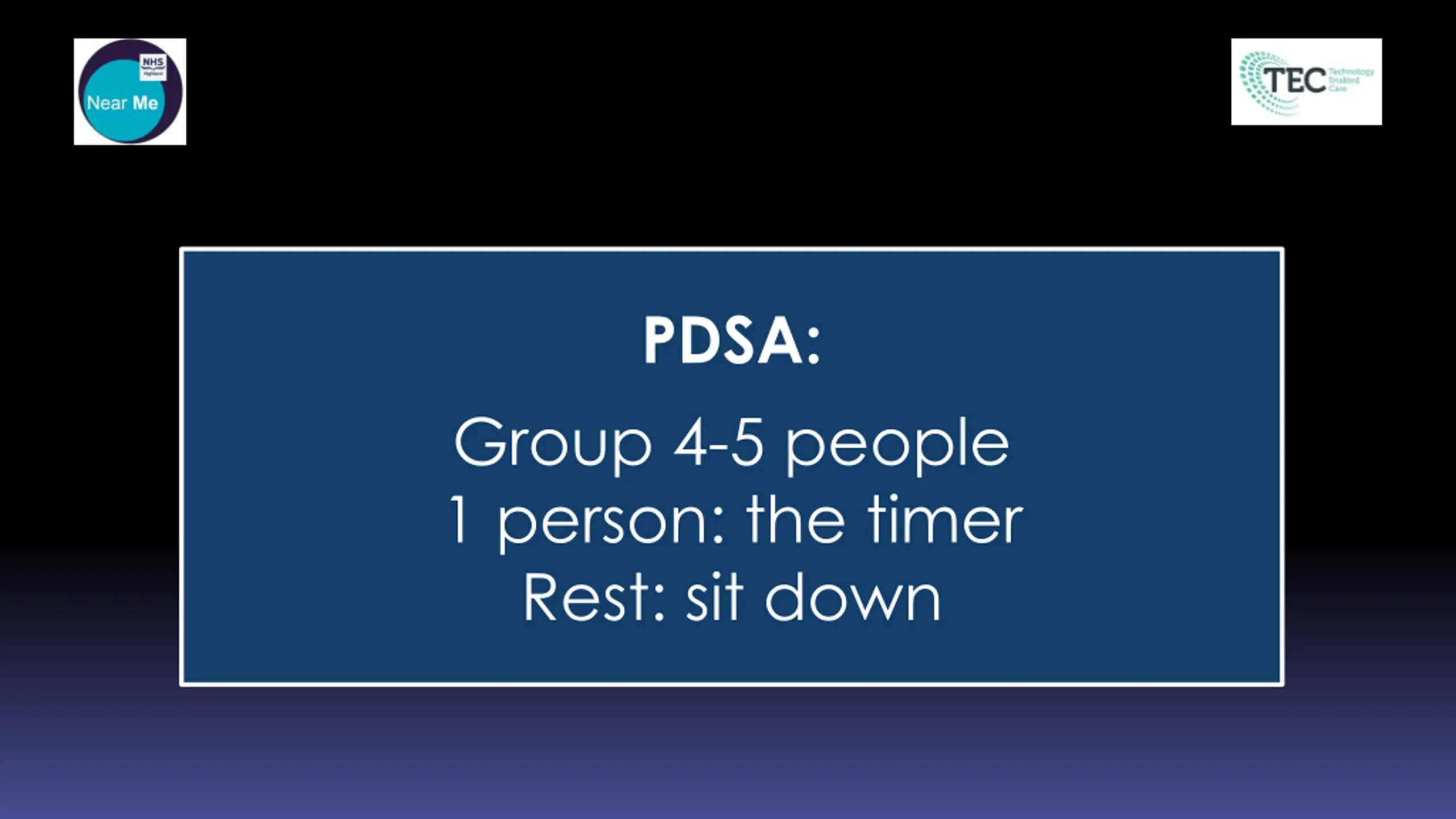 PDSA: Group 4-5 people 1 person: the timer Rest: sit down