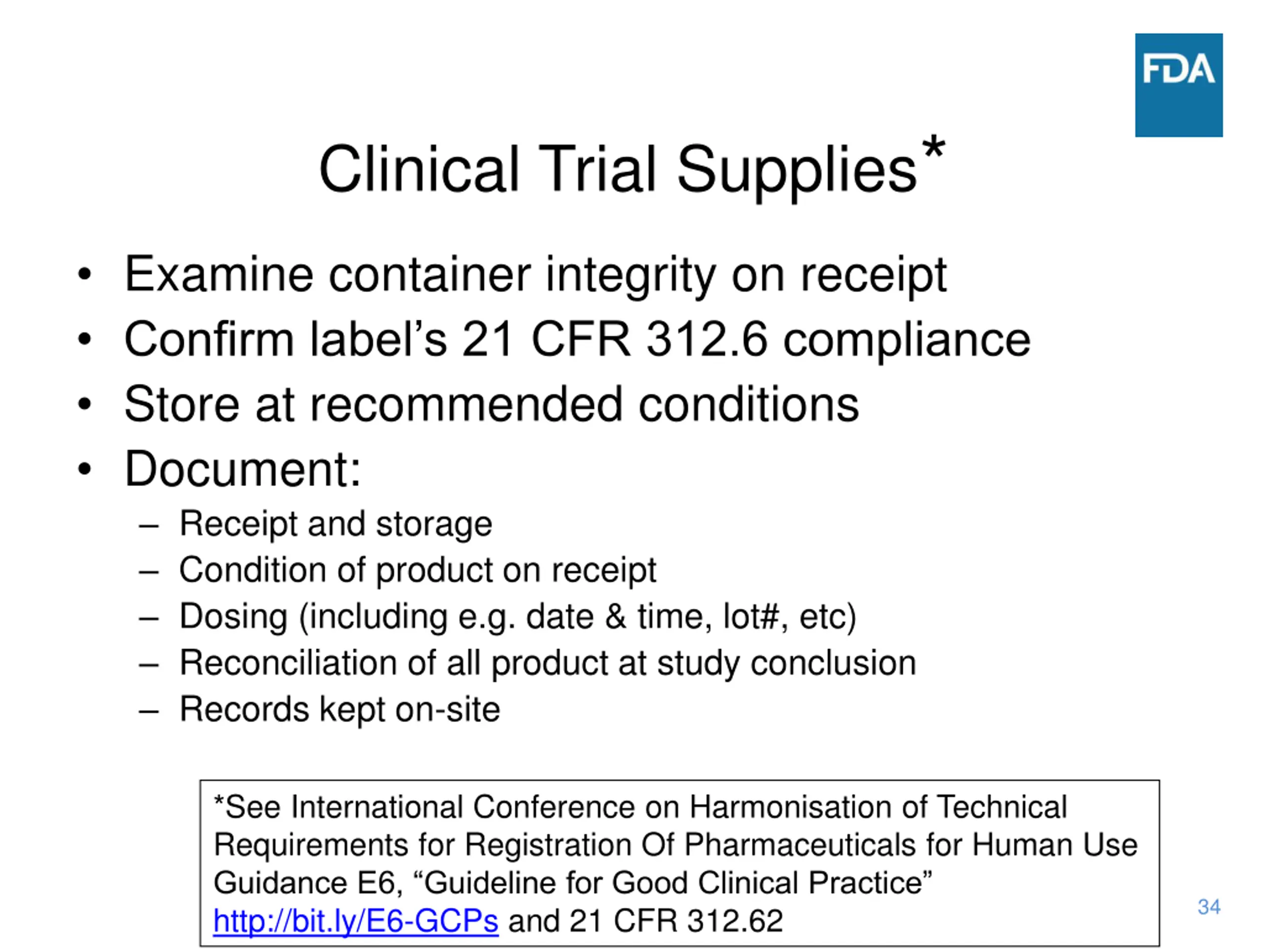 Clinical Trial Supplies* Examine container integrity on receipt Confirm label s 21 CFR 312.6 compliance Store at recommended conditions Document: Receipt and storage Condition of product on receipt Dosing (including e.g. date & time, lot#, etc) Reconciliation of all product at study conclusion Records kept on-site *See International Conference on Harmonisation of Technical Requirements for Registration Of Pharmaceuticals for Human Use Guidance E6, Guideline for Good Clinical Practice http://bit.ly/E6-GCPs and 21 CFR 312.62 34
