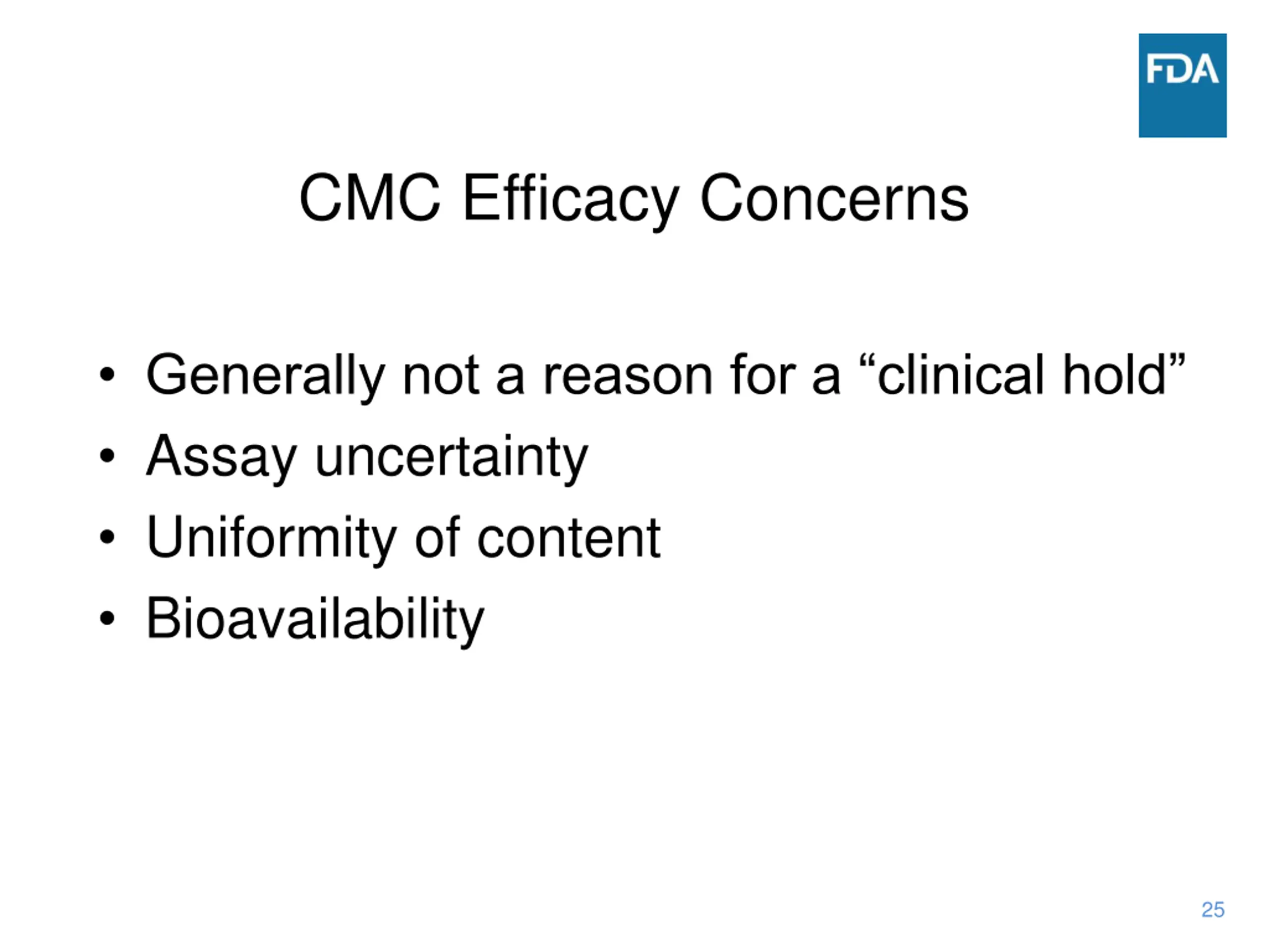 CMC Efficacy Concerns Generally not a reason for a clinical hold Assay uncertainty Uniformity of content Bioavailability 25