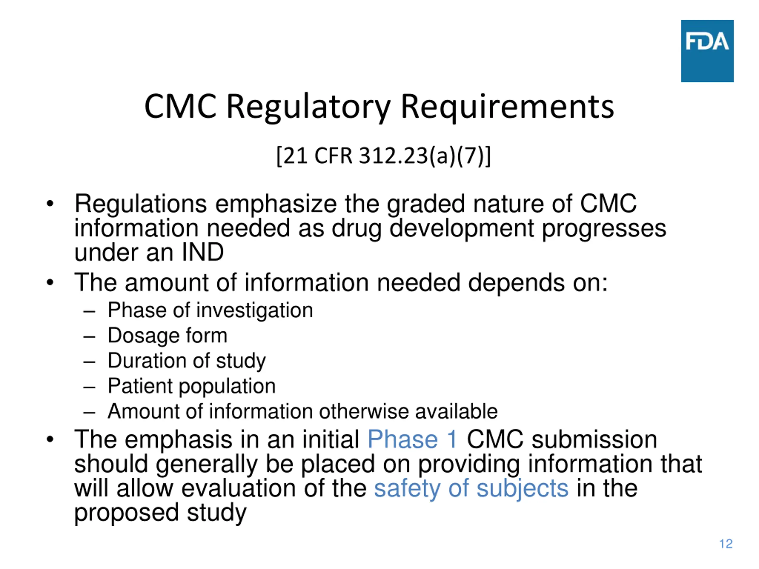 CMC Regulatory Requirements [21 CFR 312.23(a)(7)] Regulations emphasize the graded nature of CMC information needed as drug development progresses under an IND The amount of information needed depends on: Phase of investigation Dosage form Duration of study Patient population Amount of information otherwise available The emphasis in an initial Phase 1 CMC submission should generally be placed on providing information that will allow evaluation of the safety of subjects in the proposed study 12