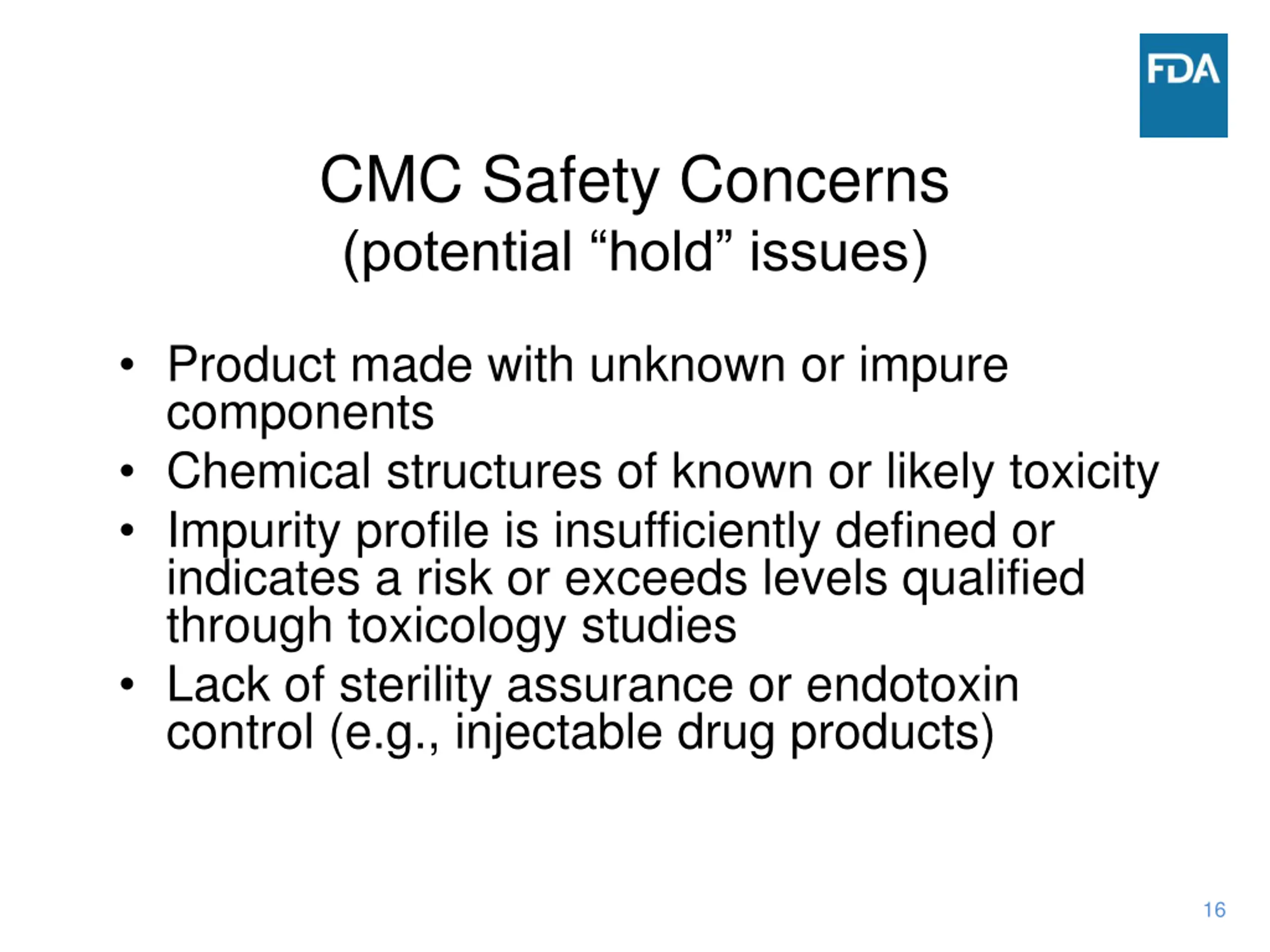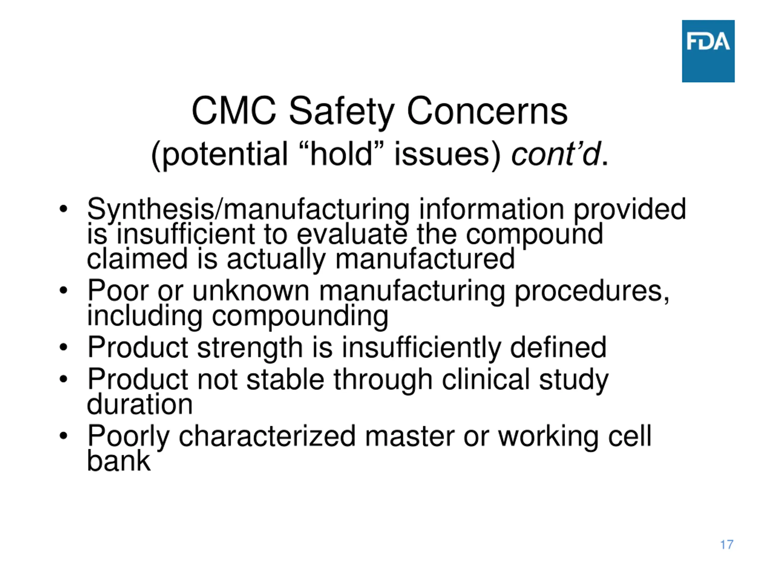 CMC Safety Concerns (potential hold issues) Product made with unknown or impure components Chemical structures of known or likely toxicity Impurity profile is insufficiently defined or indicates a risk or exceeds levels qualified through toxicology studies Lack of sterility assurance or endotoxin control (e.g., injectable drug products) 16