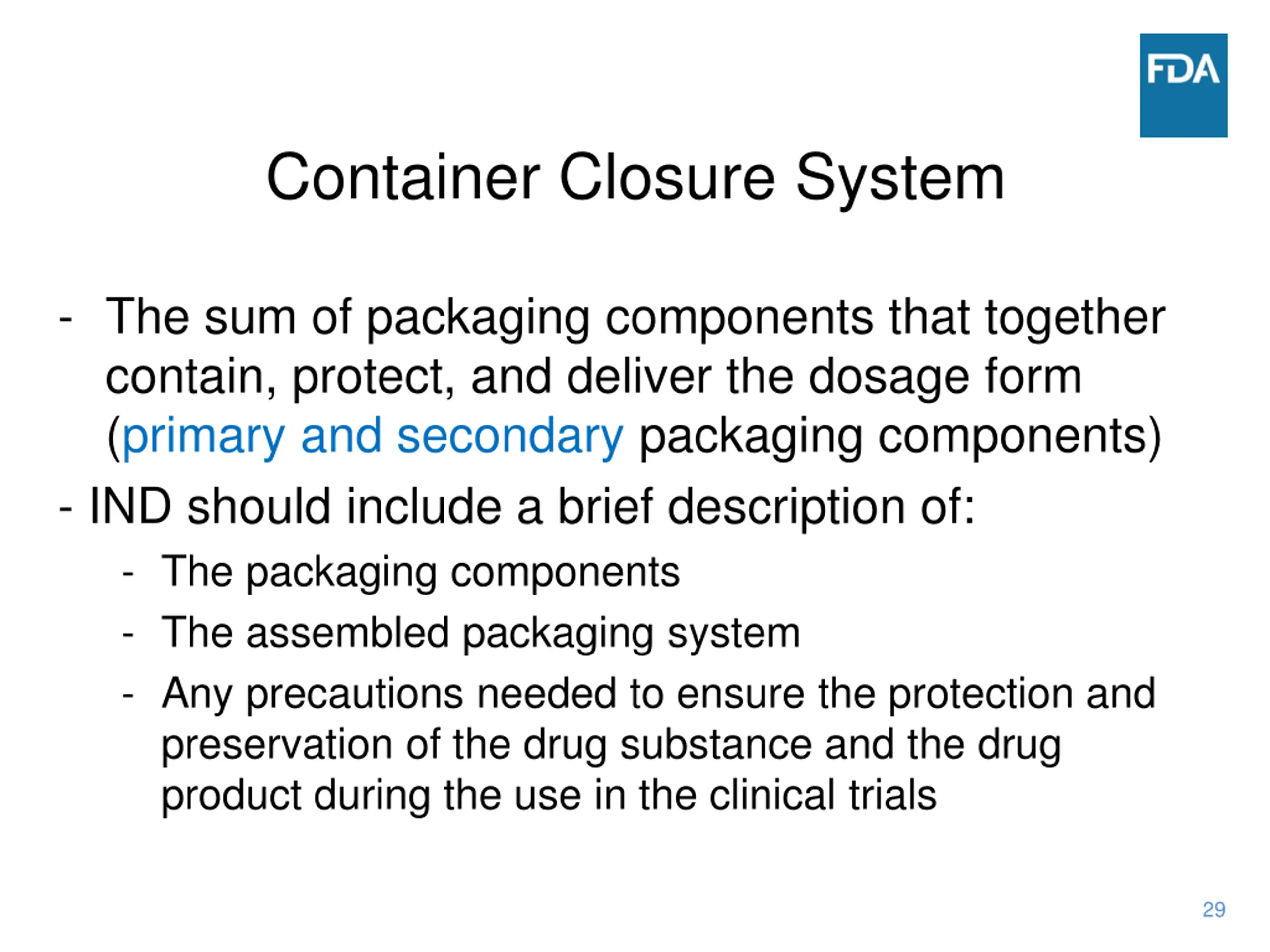 Container Closure System - The sum of packaging components that together contain, protect, and deliver the dosage form (primary and secondary packaging components) - IND should include a brief description of: - The packaging components - The assembled packaging system - Any precautions needed to ensure the protection and preservation of the drug substance and the drug product during the use in the clinical trials 29