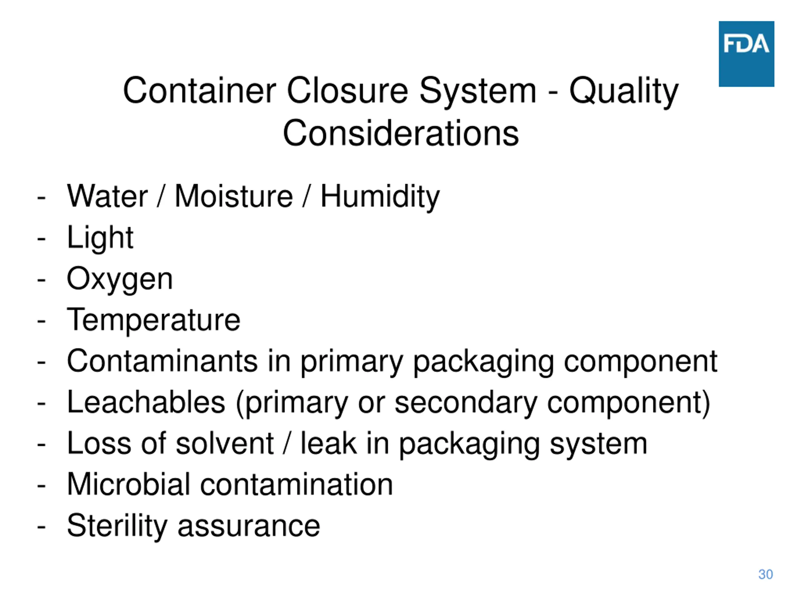 Container Closure System - Quality Considerations - Water / Moisture / Humidity - Light - Oxygen - Temperature - Contaminants in primary packaging component - Leachables (primary or secondary component) - Loss of solvent / leak in packaging system - Microbial contamination - Sterility assurance 30