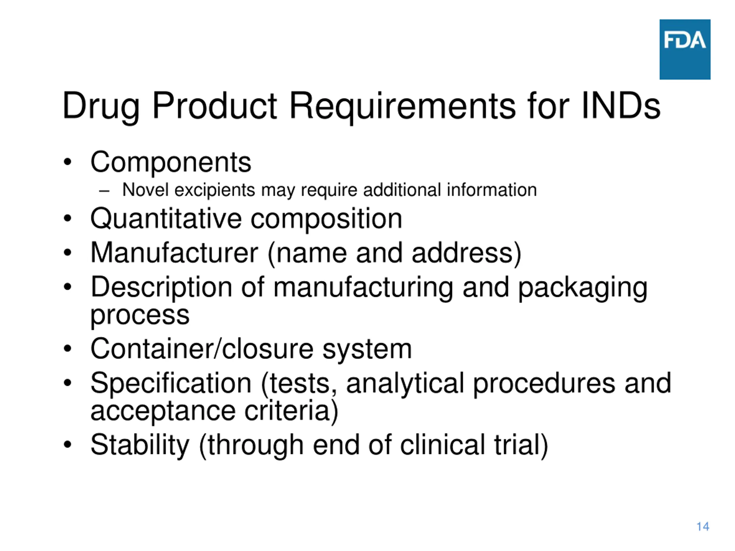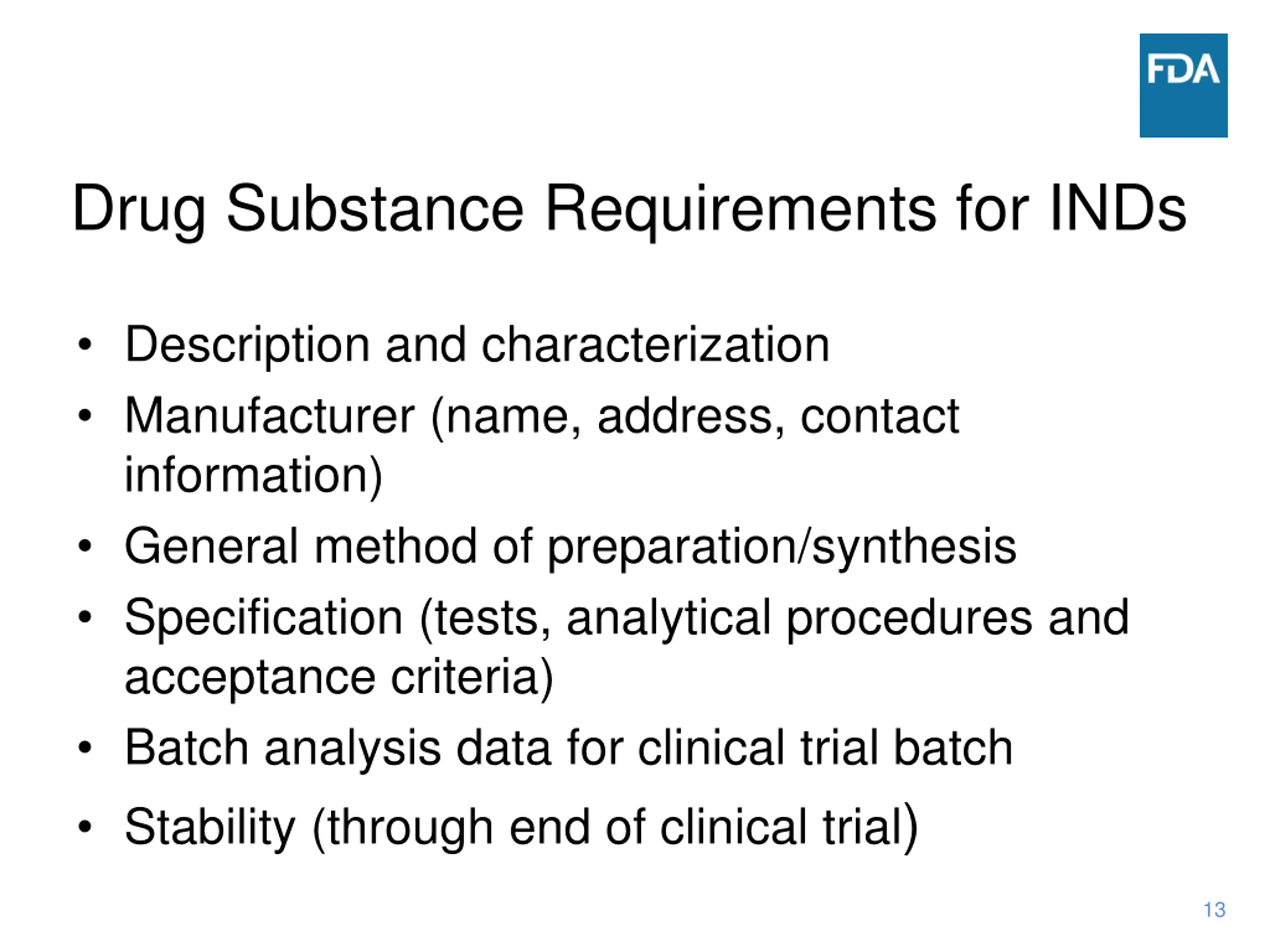 Drug Substance Requirements for INDs Description and characterization Manufacturer (name, address, contact information) General method of preparation/synthesis Specification (tests, analytical procedures and acceptance criteria) Batch analysis data for clinical trial batch Stability (through end of clinical trial) 13