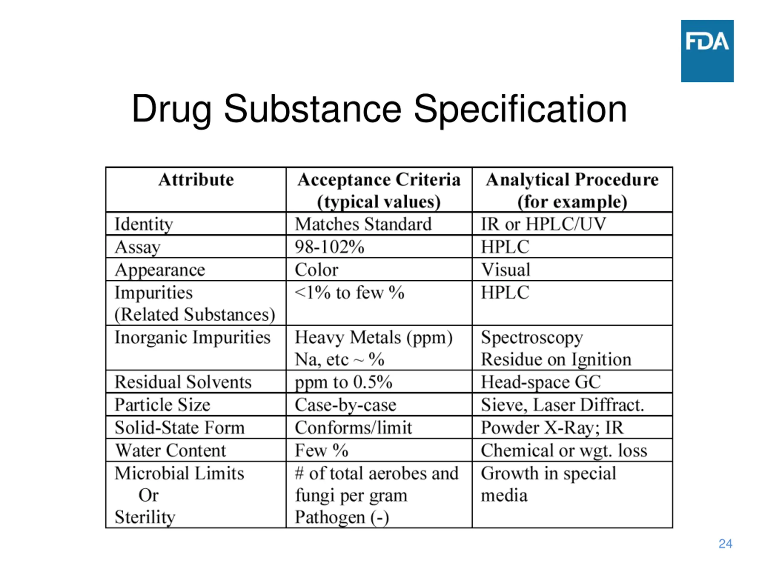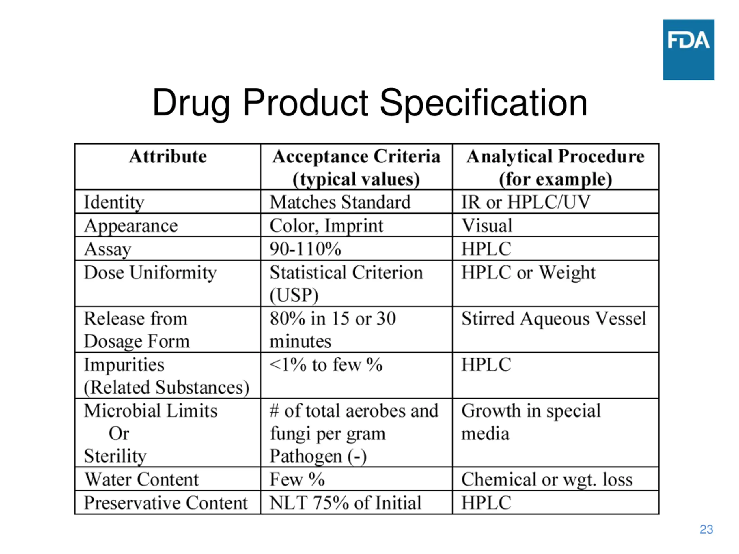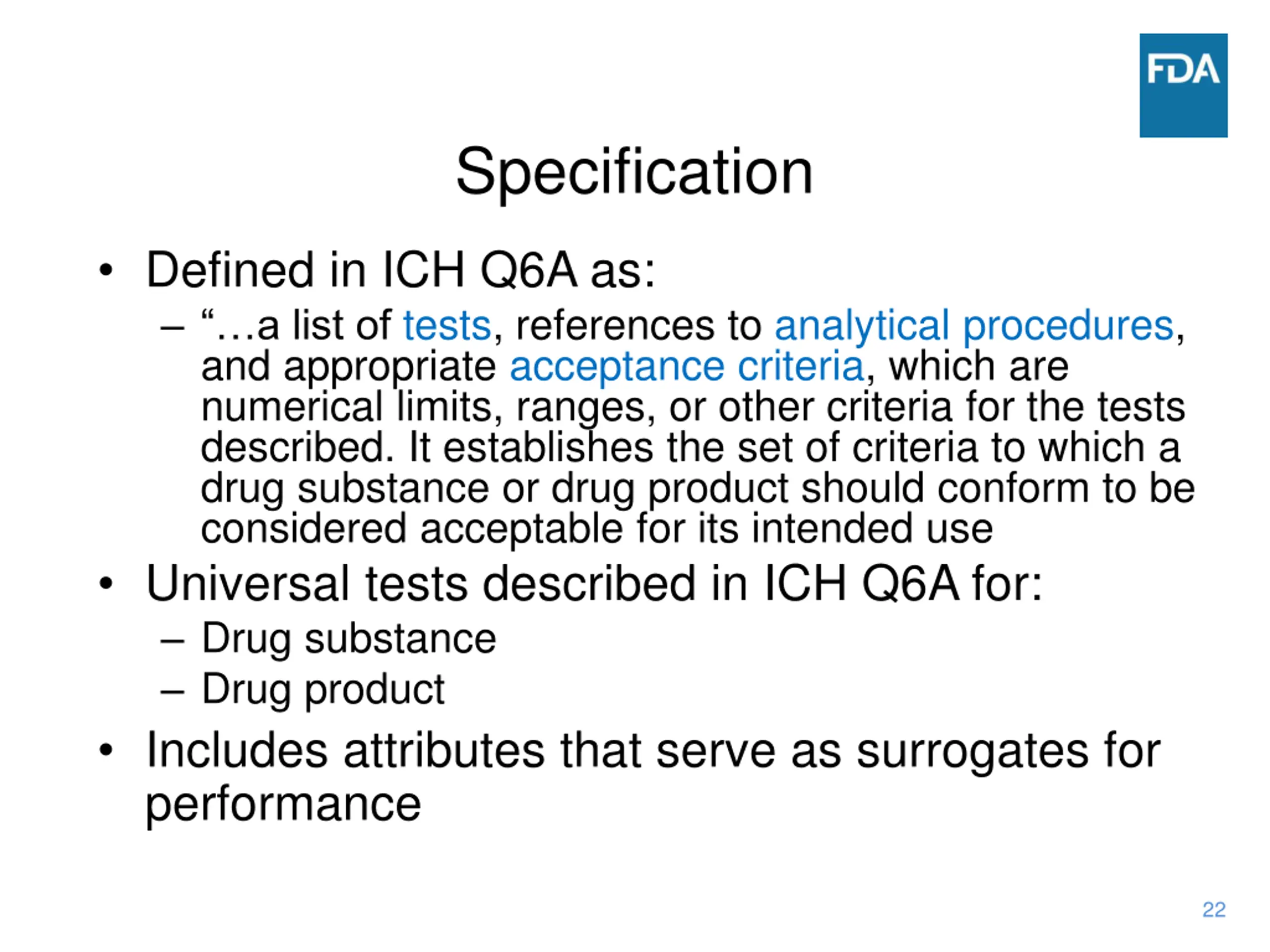 Specification Defined in ICH Q6A as: a list of tests, references to analytical procedures, and appropriate acceptance criteria, which are numerical limits, ranges, or other criteria for the tests described. It establishes the set of criteria to which a drug substance or drug product should conform to be considered acceptable for its intended use Universal tests described in ICH Q6A for: Drug substance Drug product Includes attributes that serve as surrogates for performance 22