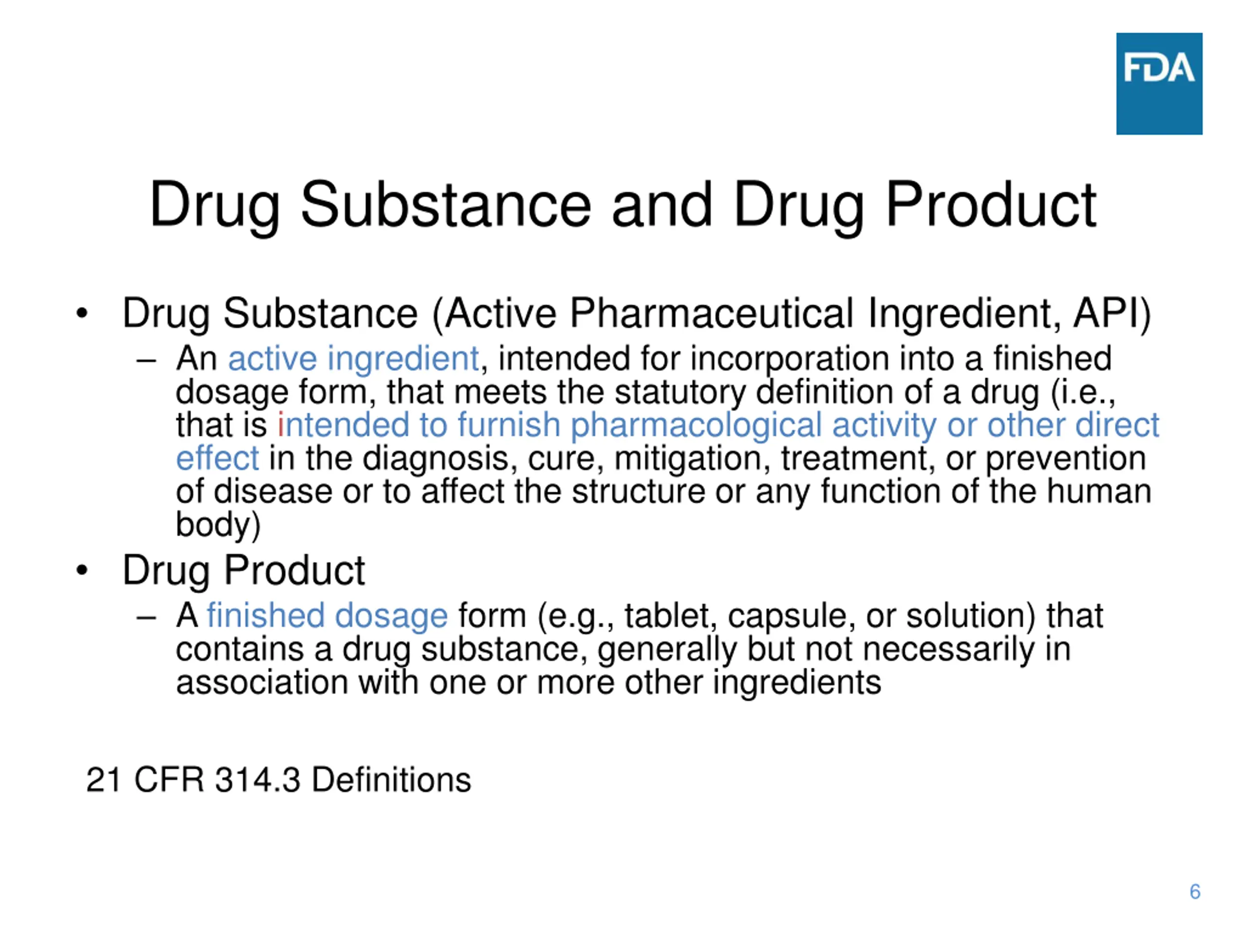 Drug Substance and Drug Product Drug Substance (Active Pharmaceutical Ingredient, API) An active ingredient, intended for incorporation into a finished dosage form, that meets the statutory definition of a drug (i.e., that is intended to furnish pharmacological activity or other direct effect in the diagnosis, cure, mitigation, treatment, or prevention of disease or to affect the structure or any function of the human body) Drug Product A finished dosage form (e.g., tablet, capsule, or solution) that contains a drug substance, generally but not necessarily in association with one or more other ingredients 21 CFR 314.3 Definitions 6