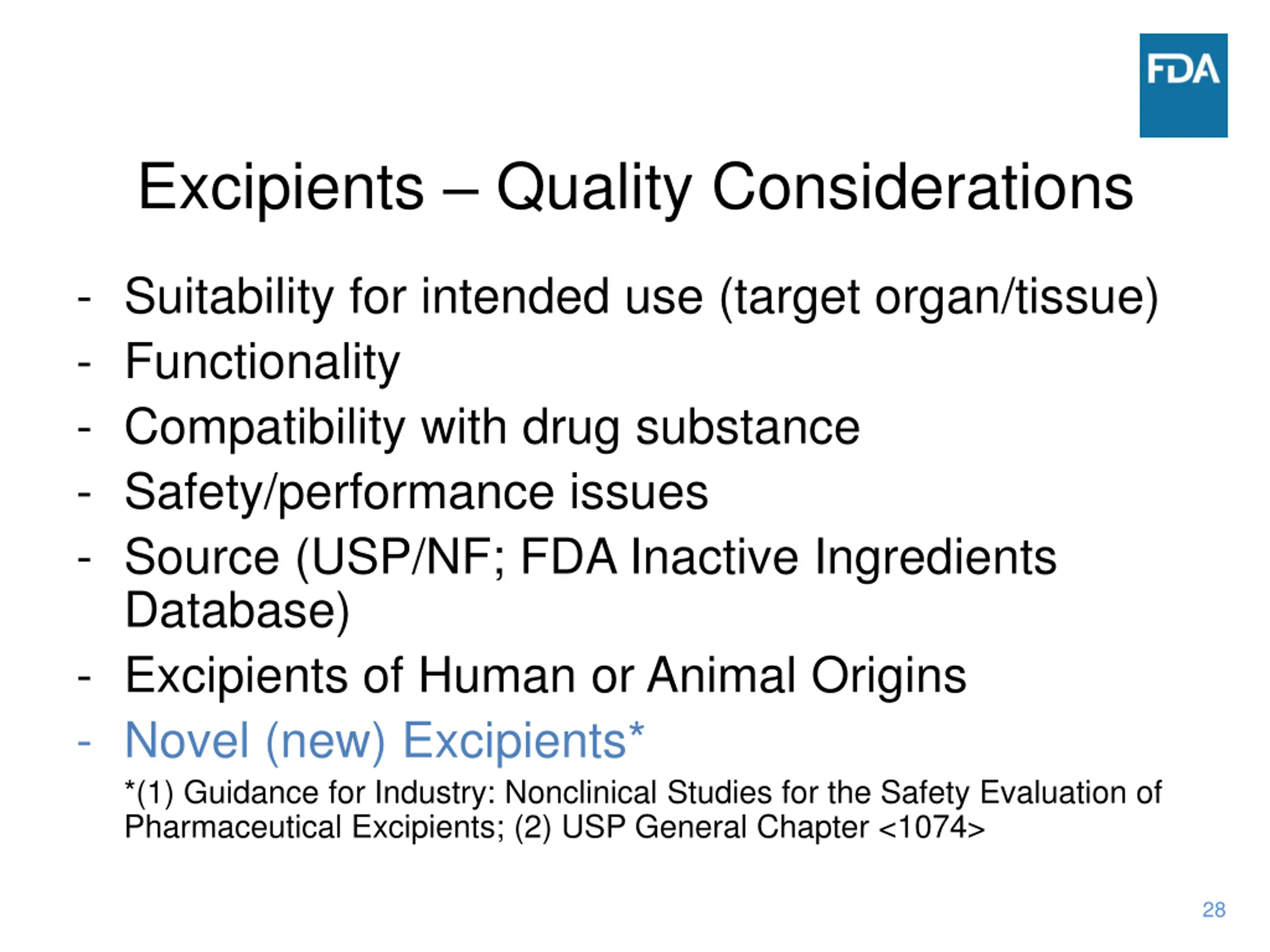 Excipients Quality Considerations - Suitability for intended use (target organ/tissue) - Functionality - Compatibility with drug substance - Safety/performance issues - Source (USP/NF; FDA Inactive Ingredients Database) - Excipients of Human or Animal Origins - Novel (new) Excipients* *(1) Guidance for Industry: Nonclinical Studies for the Safety Evaluation of Pharmaceutical Excipients; (2) USP General Chapter <1074> 28