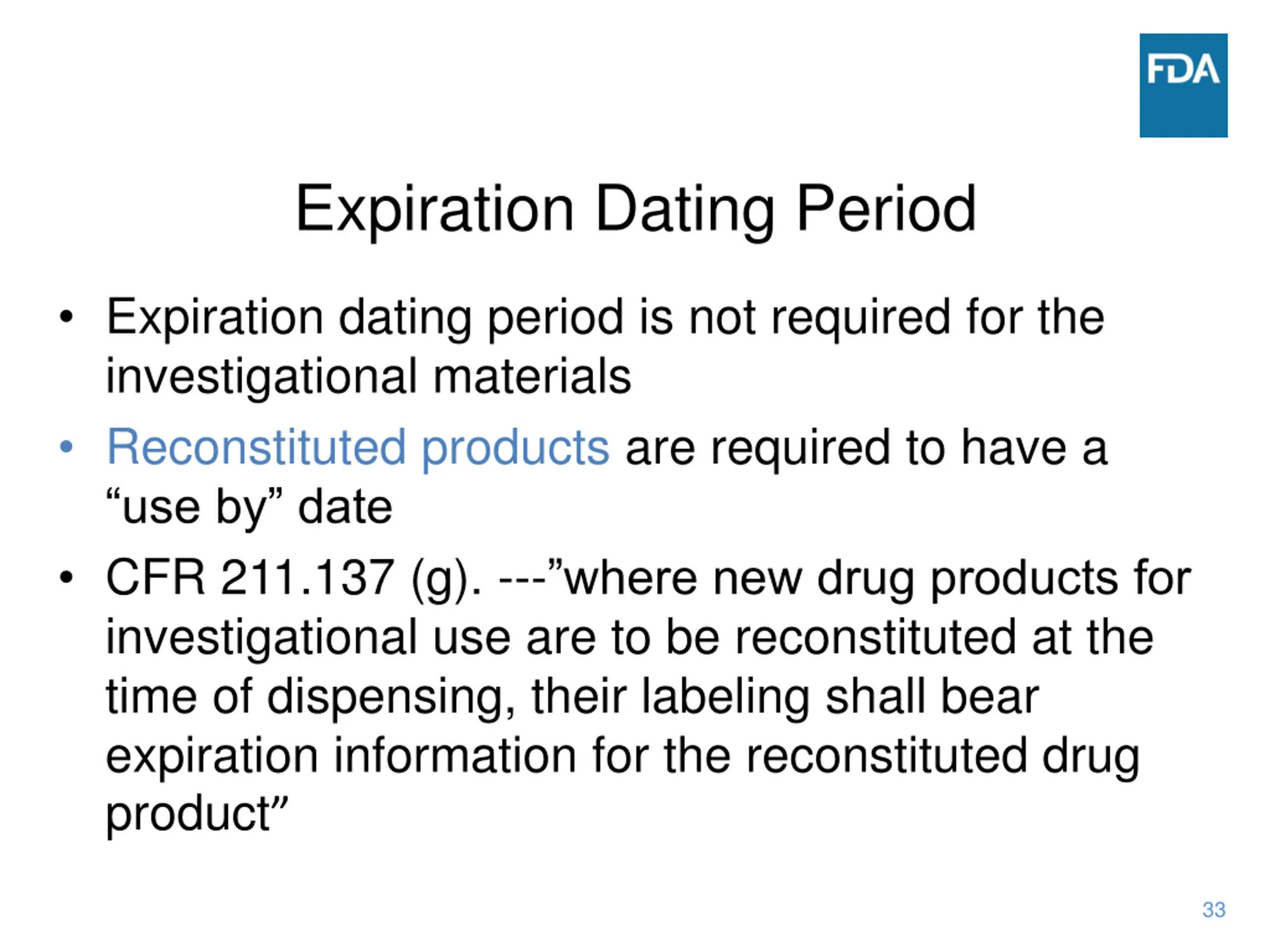 Expiration Dating Period Expiration dating period is not required for the investigational materials Reconstituted products are required to have a use by date CFR 211.137 (g). --- where new drug products for investigational use are to be reconstituted at the time of dispensing, their labeling shall bear expiration information for the reconstituted drug product 33