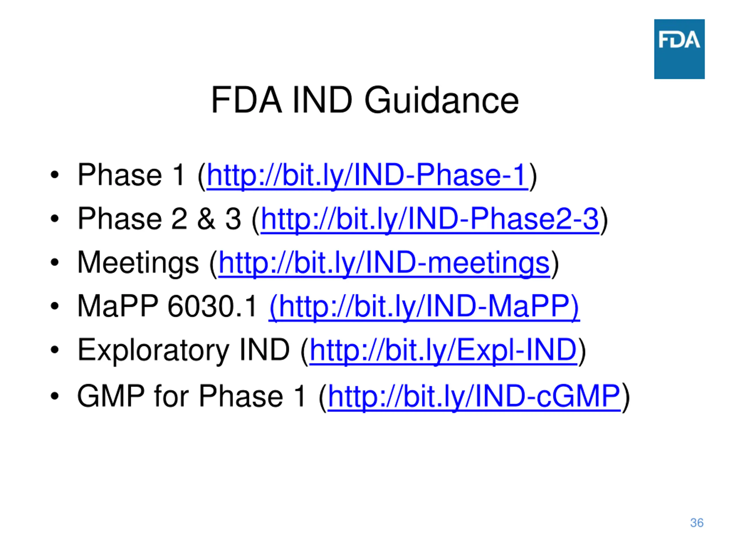 FDA IND Guidance Phase 1 (http://bit.ly/IND-Phase-1) Phase 2 & 3 (http://bit.ly/IND-Phase2-3) Meetings (http://bit.ly/IND-meetings) MaPP 6030.1 (http://bit.ly/IND-MaPP) Exploratory IND (http://bit.ly/Expl-IND) GMP for Phase 1 (http://bit.ly/IND-cGMP) 36