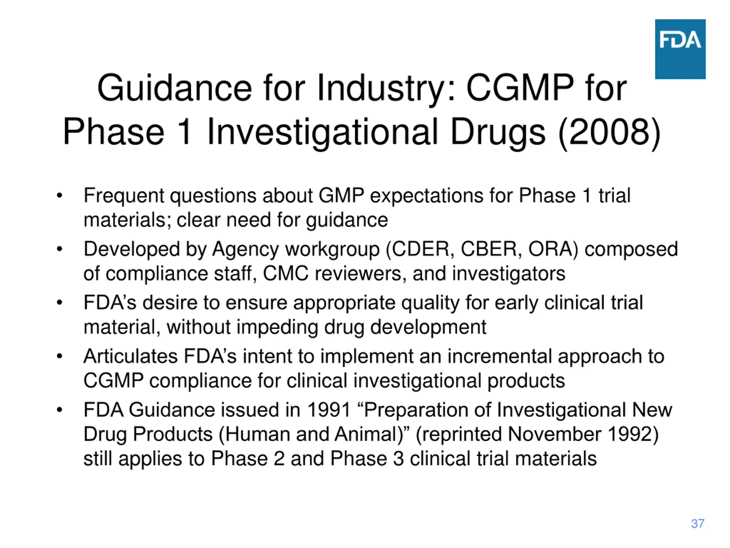 Guidance for Industry: CGMP for Phase 1 Investigational Drugs (2008) Frequent questions about GMP expectations for Phase 1 trial materials; clear need for guidance Developed by Agency workgroup (CDER, CBER, ORA) composed of compliance staff, CMC reviewers, and investigators FDA s desire to ensure appropriate quality for early clinical trial material, without impeding drug development Articulates FDA s intent to implement an incremental approach to CGMP compliance for clinical investigational products FDA Guidance issued in 1991 Preparation of Investigational New Drug Products (Human and Animal) (reprinted November 1992) still applies to Phase 2 and Phase 3 clinical trial materials 37