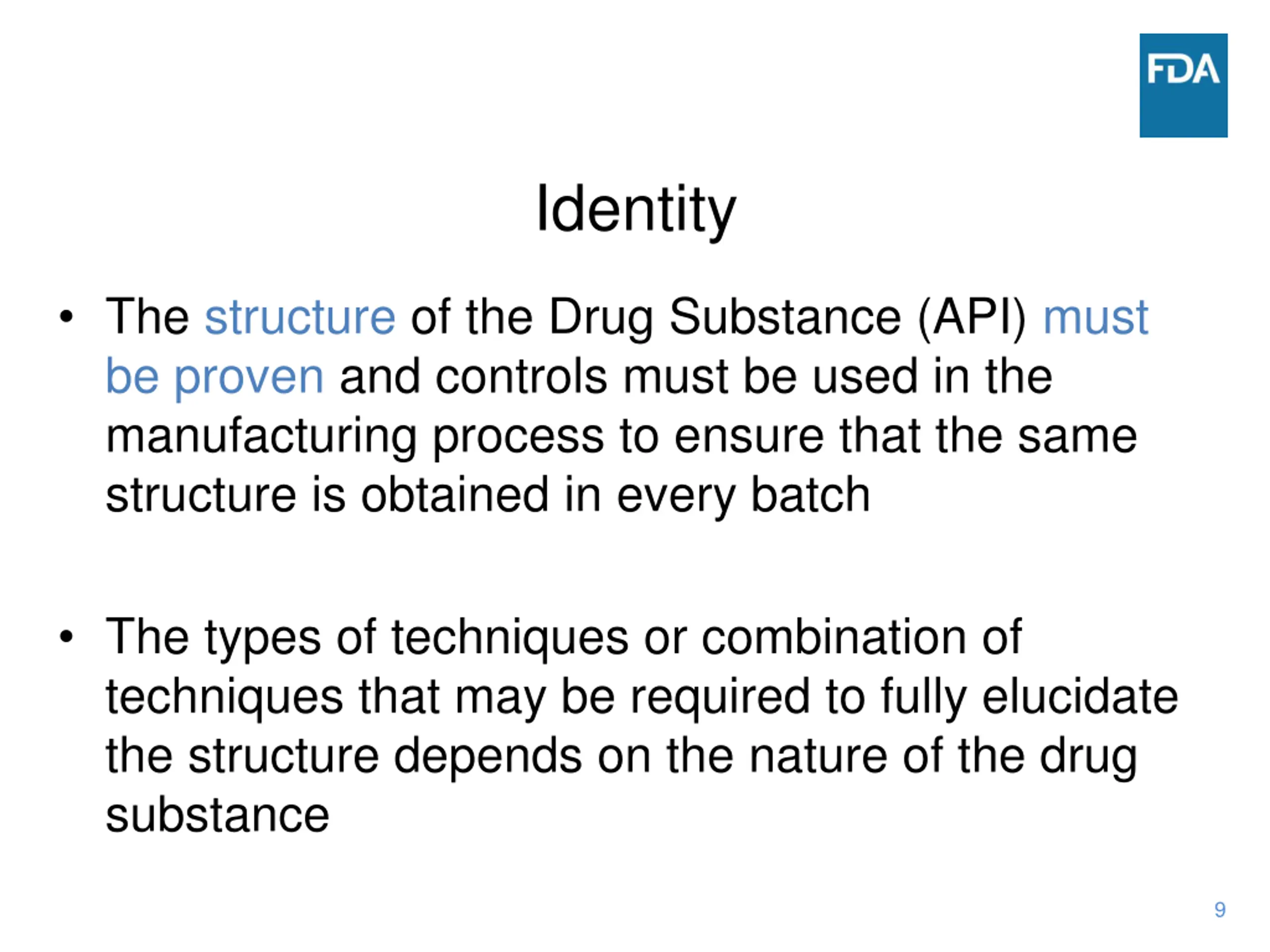 Identity The structure of the Drug Substance (API) must be proven and controls must be used in the manufacturing process to ensure that the same structure is obtained in every batch The types of techniques or combination of techniques that may be required to fully elucidate the structure depends on the nature of the drug substance 9