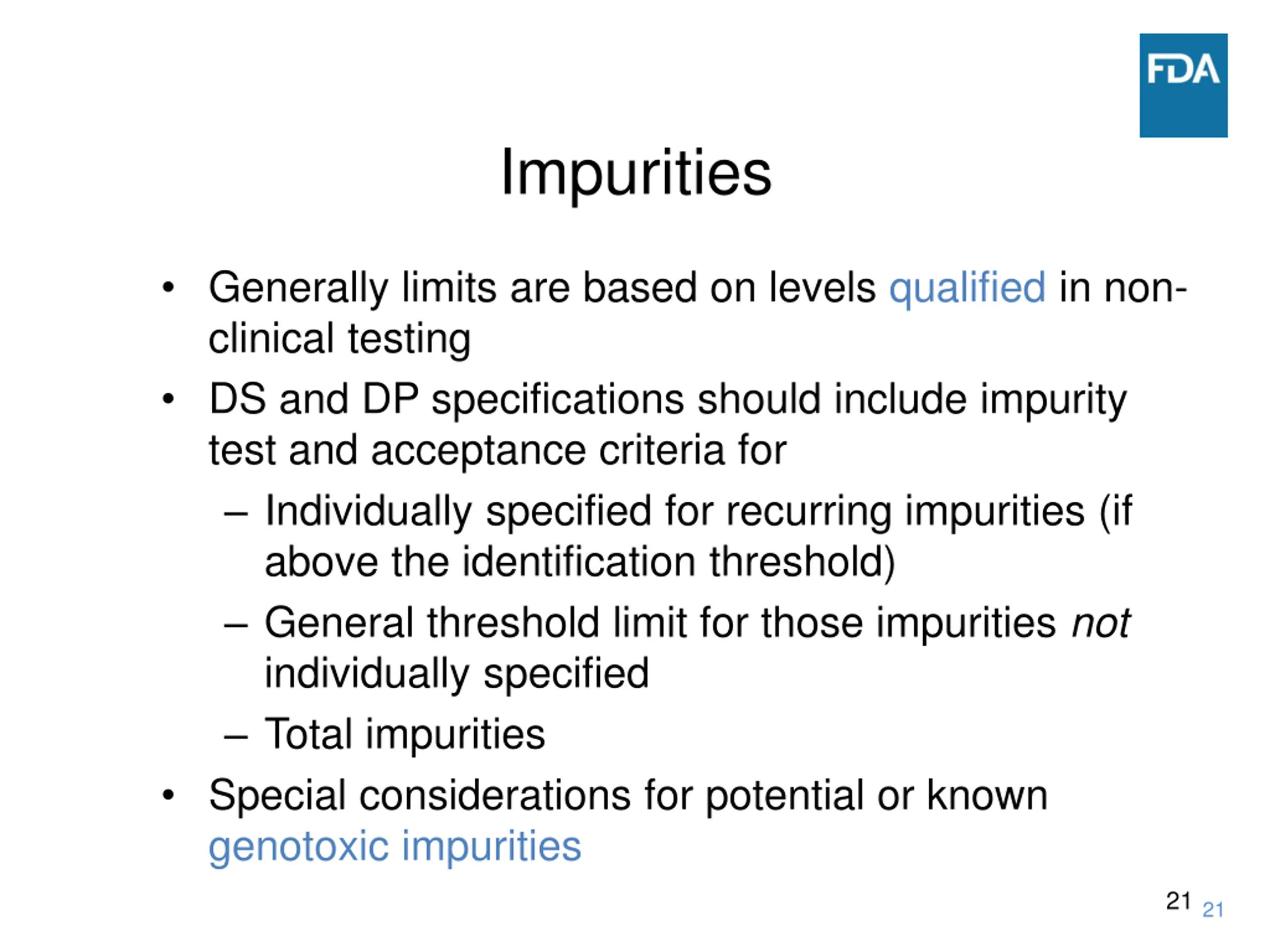 Impurities Generally limits are based on levels qualified in non- clinical testing DS and DP specifications should include impurity test and acceptance criteria for Individually specified for recurring impurities (if above the identification threshold) General threshold limit for those impurities not individually specified Total impurities Special considerations for potential or known genotoxic impurities 21 21