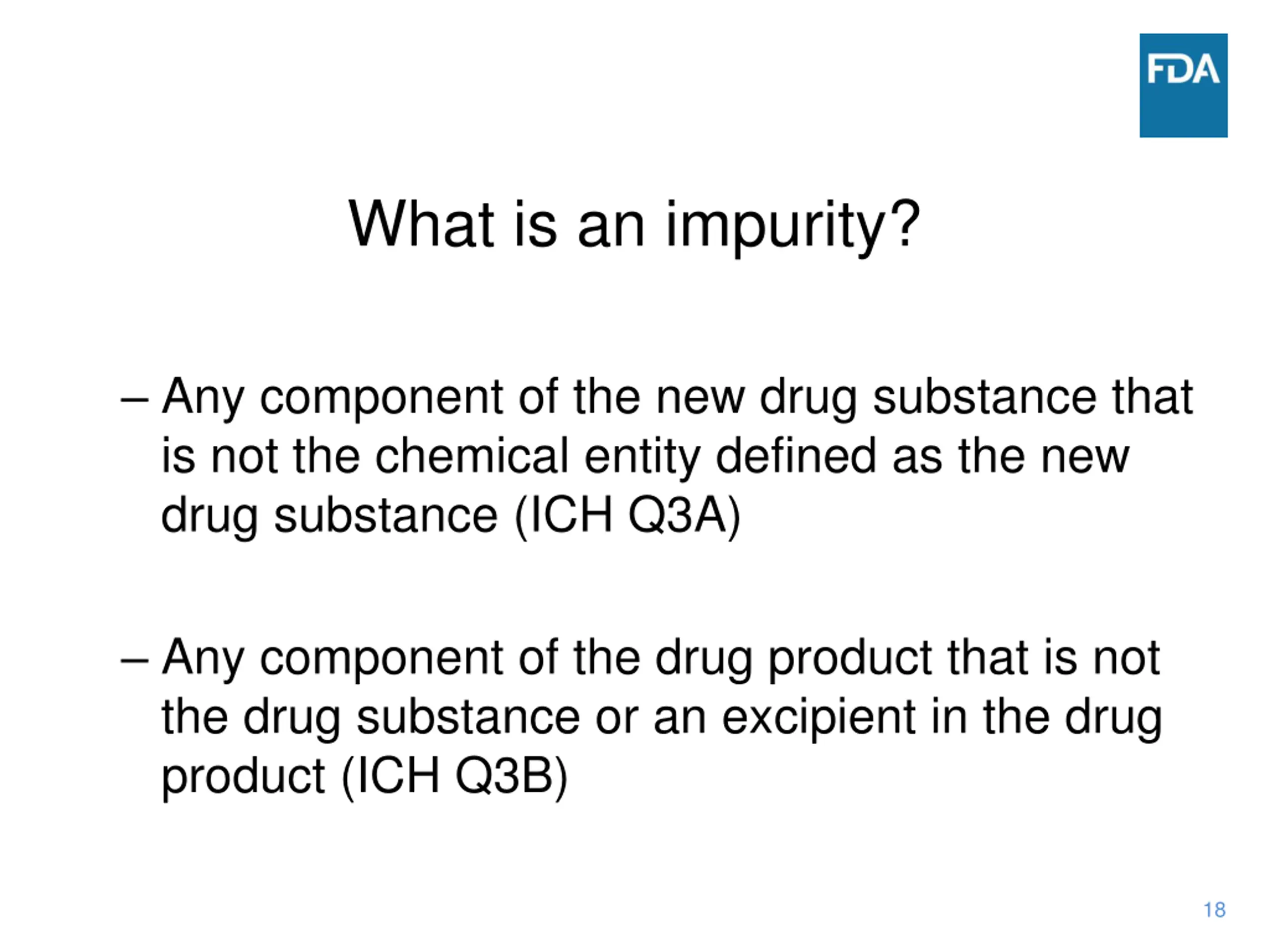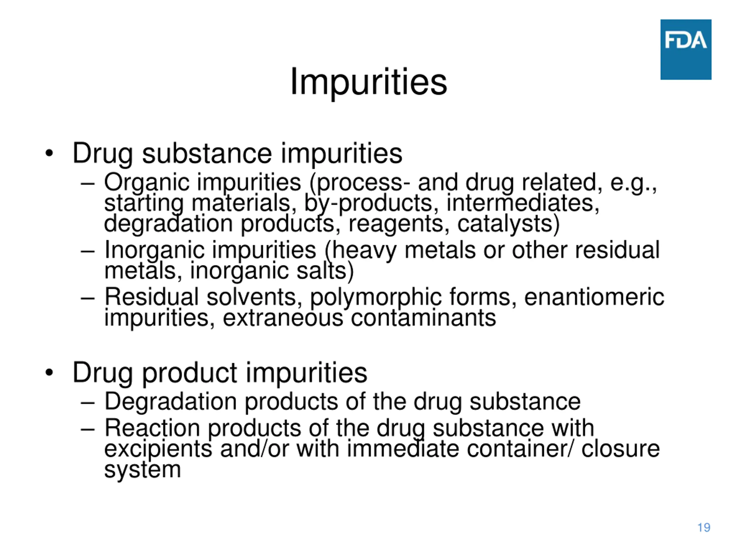 What is an impurity? Any component of the new drug substance that is not the chemical entity defined as the new drug substance (ICH Q3A) Any component of the drug product that is not the drug substance or an excipient in the drug product (ICH Q3B) 18