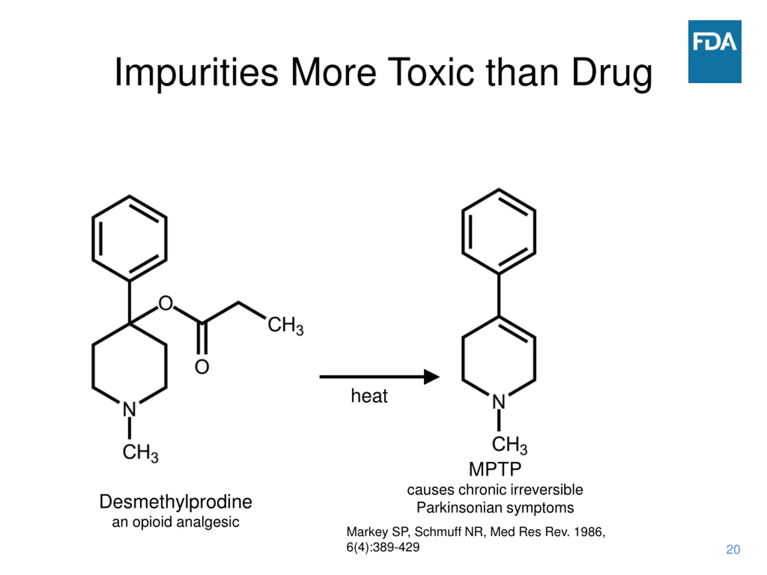 Impurities More Toxic than Drug heat MPTP causes chronic irreversible Parkinsonian symptoms Desmethylprodine an opioid analgesic Markey SP, Schmuff NR, Med Res Rev. 1986, 6(4):389-429 20
