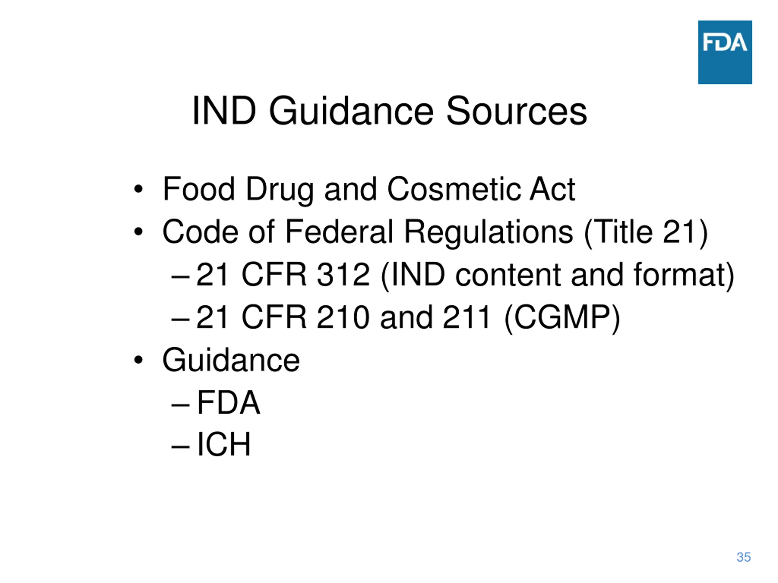 IND Guidance Sources Food Drug and Cosmetic Act Code of Federal Regulations (Title 21) 21 CFR 312 (IND content and format) 21 CFR 210 and 211 (CGMP) Guidance FDA ICH 35