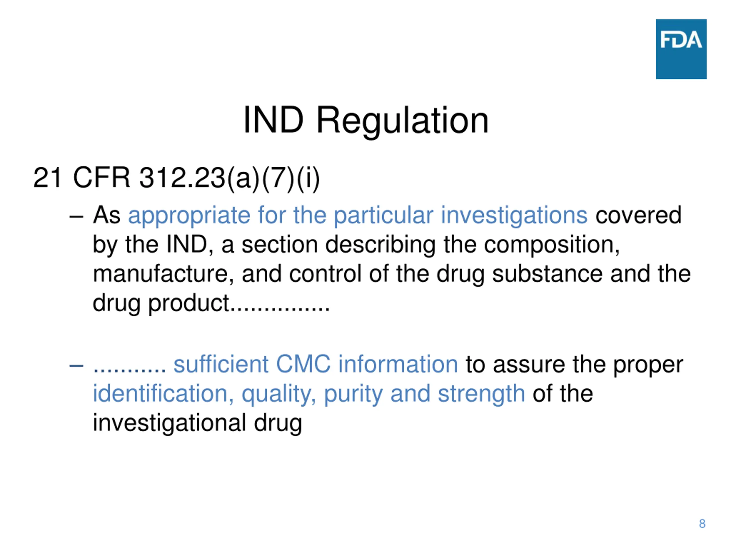 IND Regulation 21 CFR 312.23(a)(7)(i) As appropriate for the particular investigations covered by the IND, a section describing the composition, manufacture, and control of the drug substance and the drug product............... ........... sufficient CMC information to assure the proper identification, quality, purity and strength of the investigational drug 8