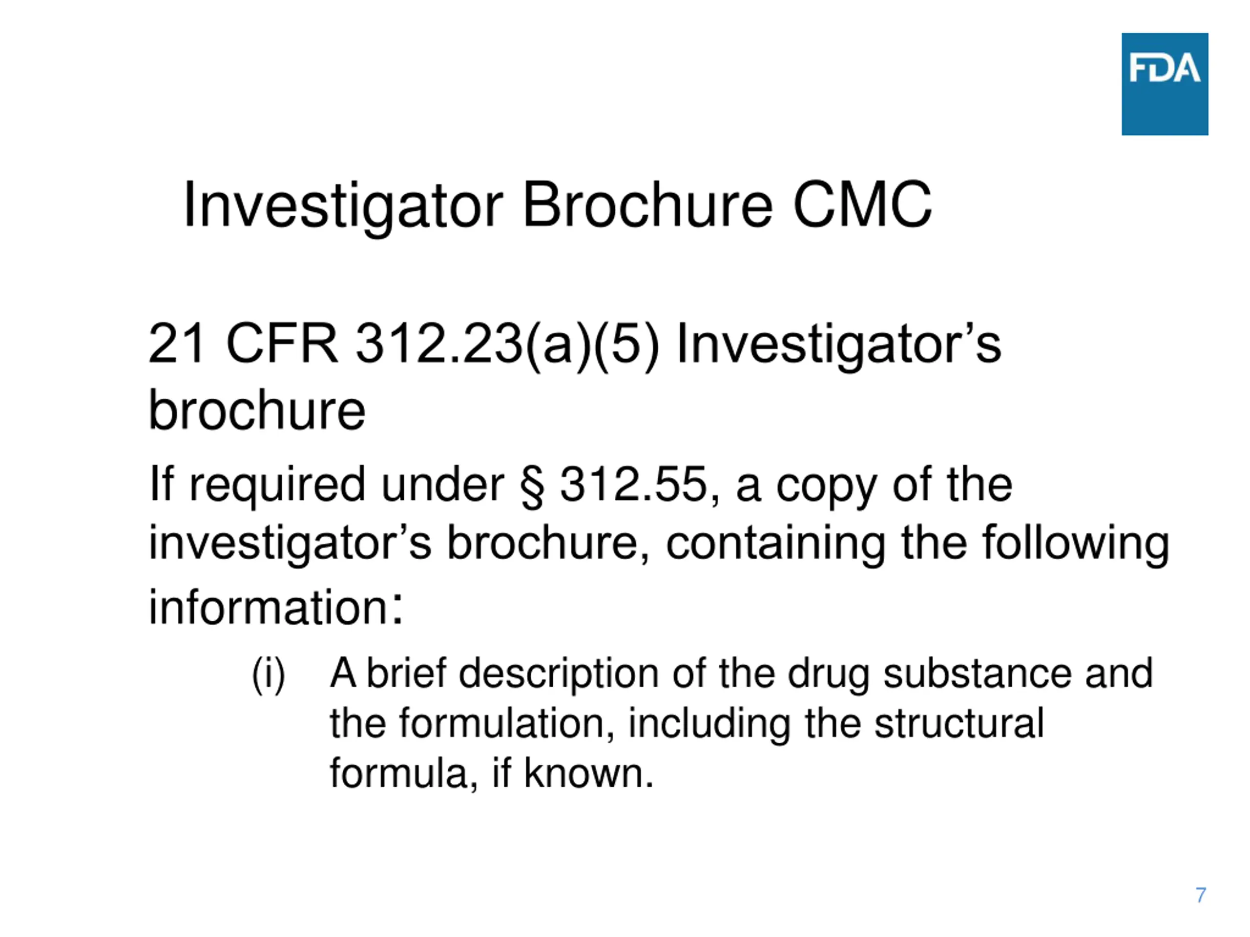 Investigator Brochure CMC 21 CFR 312.23(a)(5) Investigator s brochure If required under 312.55, a copy of the investigator s brochure, containing the following information: (i) A brief description of the drug substance and the formulation, including the structural formula, if known. 7