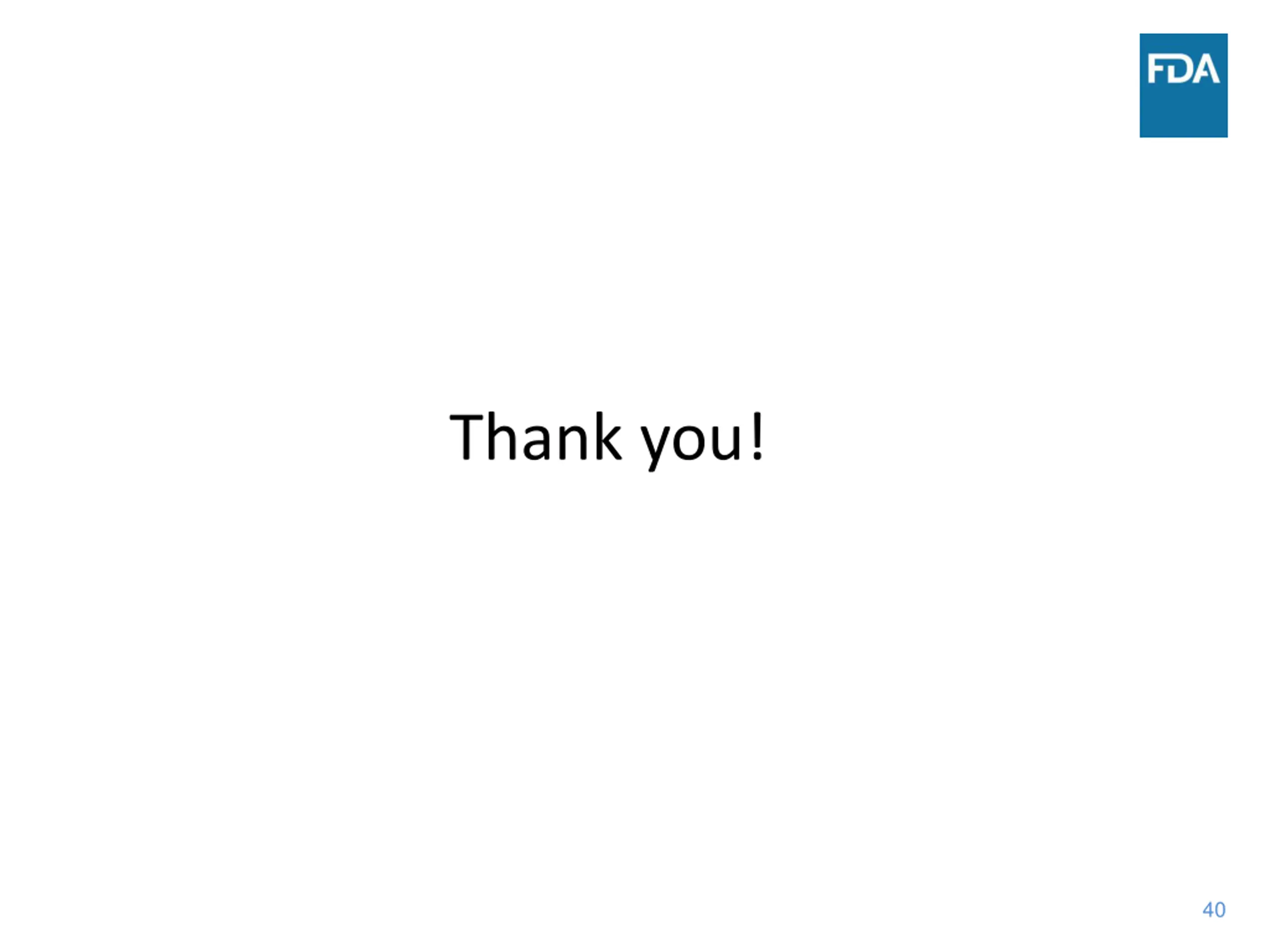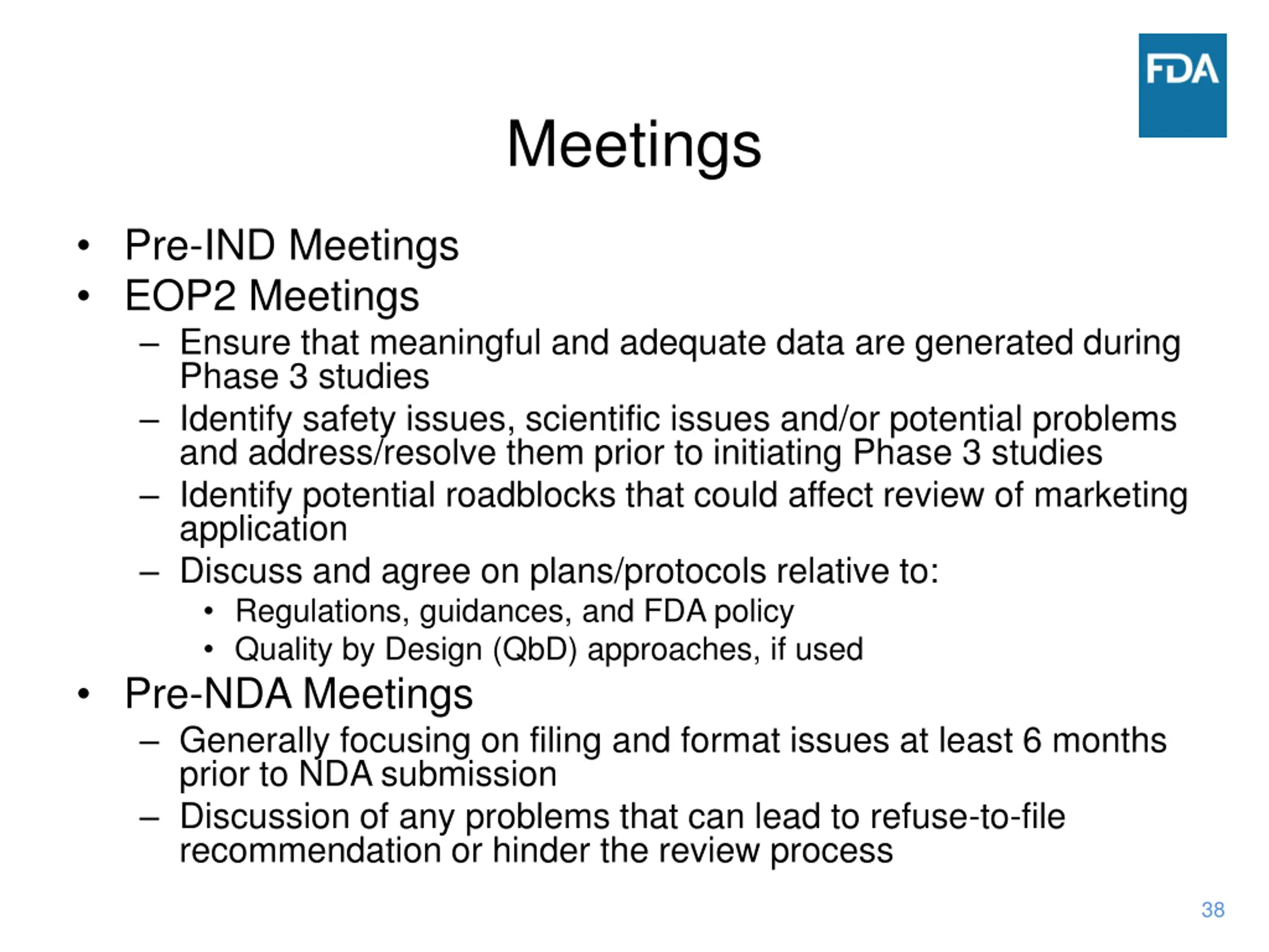 Meetings Pre-IND Meetings EOP2 Meetings Ensure that meaningful and adequate data are generated during Phase 3 studies Identify safety issues, scientific issues and/or potential problems and address/resolve them prior to initiating Phase 3 studies Identify potential roadblocks that could affect review of marketing application Discuss and agree on plans/protocols relative to: Regulations, guidances, and FDA policy Quality by Design (QbD) approaches, if used Pre-NDA Meetings Generally focusing on filing and format issues at least 6 months prior to NDA submission Discussion of any problems that can lead to refuse-to-file recommendation or hinder the review process 38
