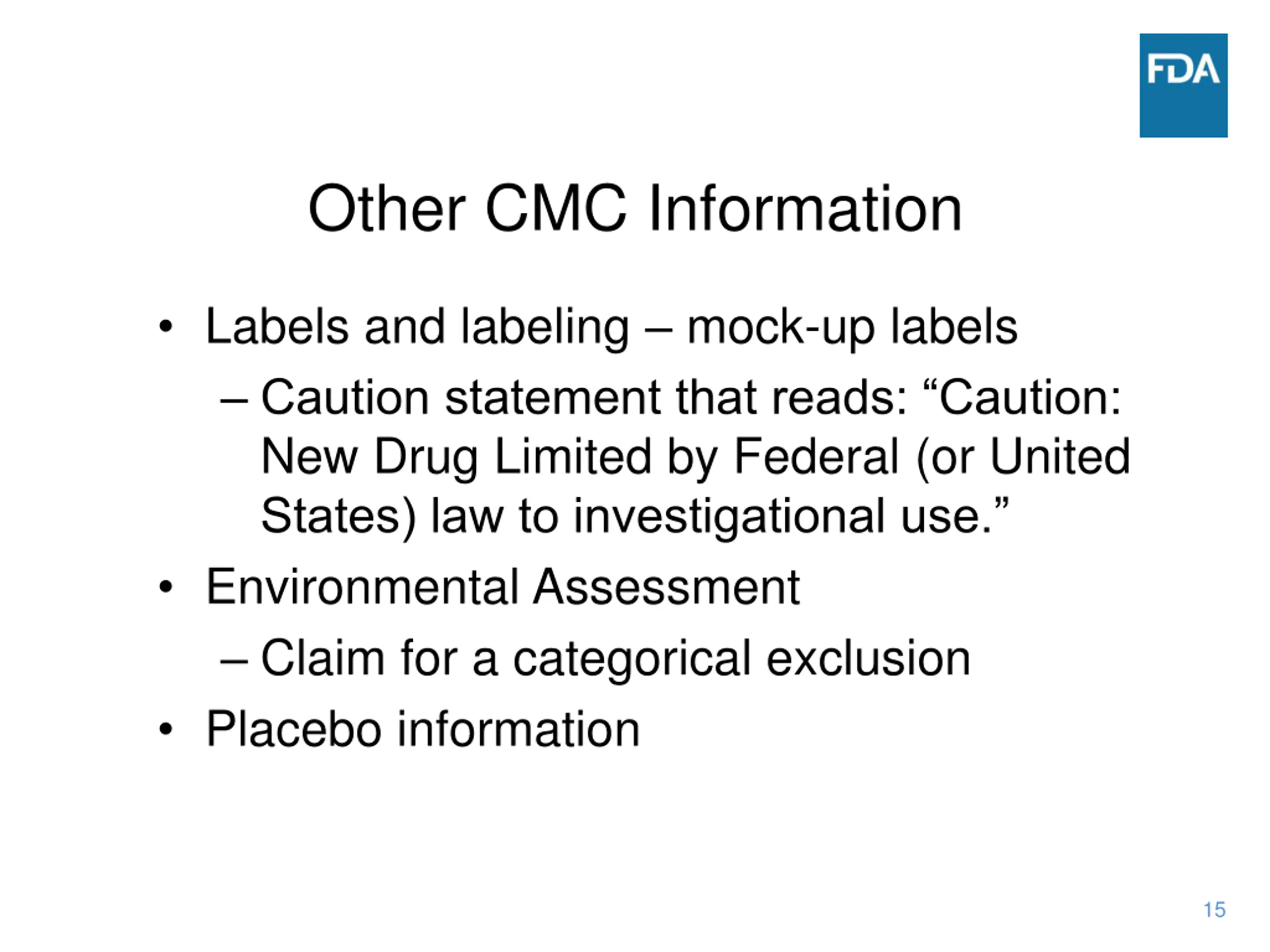 Other CMC Information Labels and labeling mock-up labels Caution statement that reads: Caution: New Drug Limited by Federal (or United States) law to investigational use. Environmental Assessment Claim for a categorical exclusion Placebo information 15