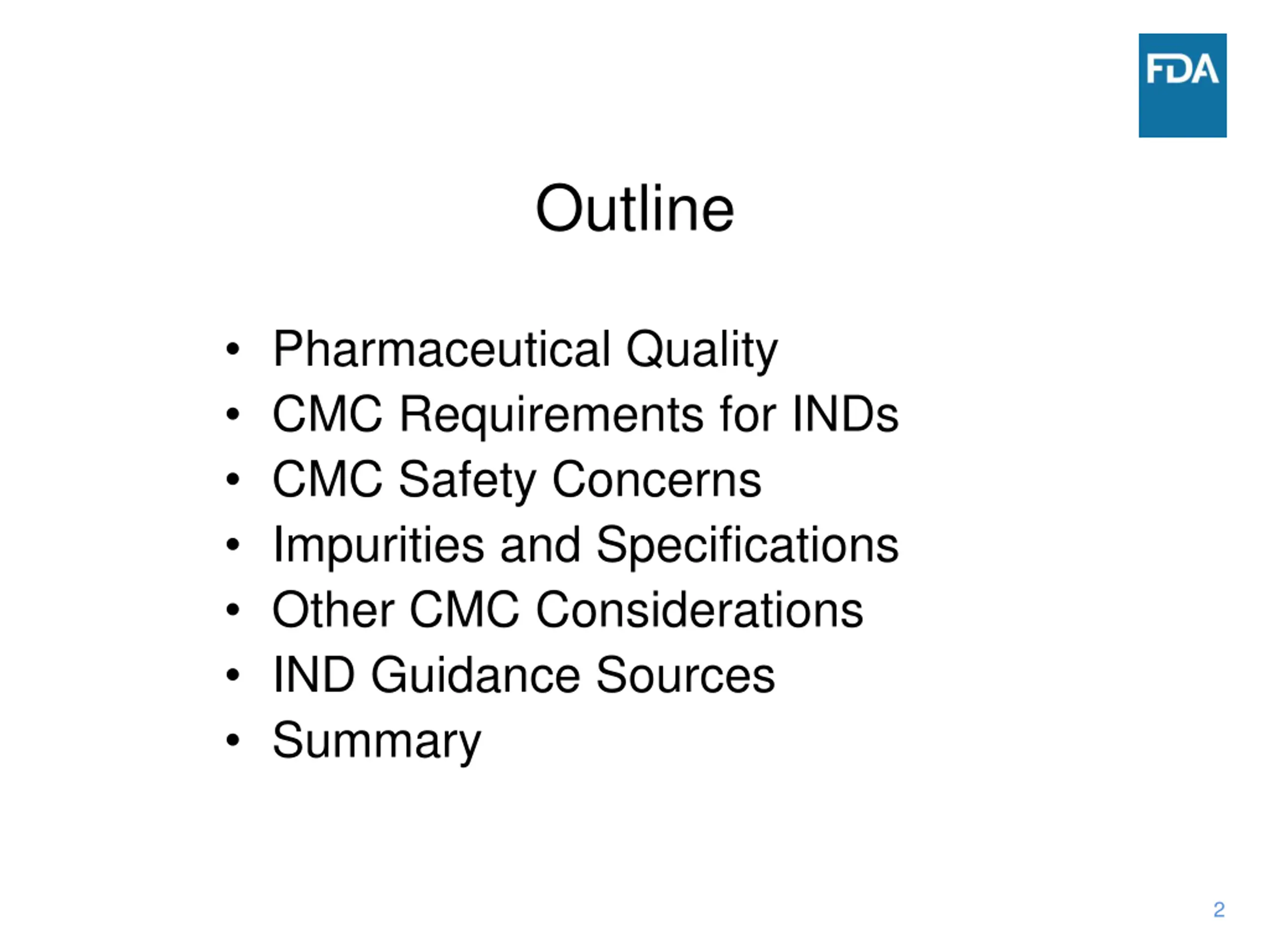 Outline Pharmaceutical Quality CMC Requirements for INDs CMC Safety Concerns Impurities and Specifications Other CMC Considerations IND Guidance Sources Summary 2