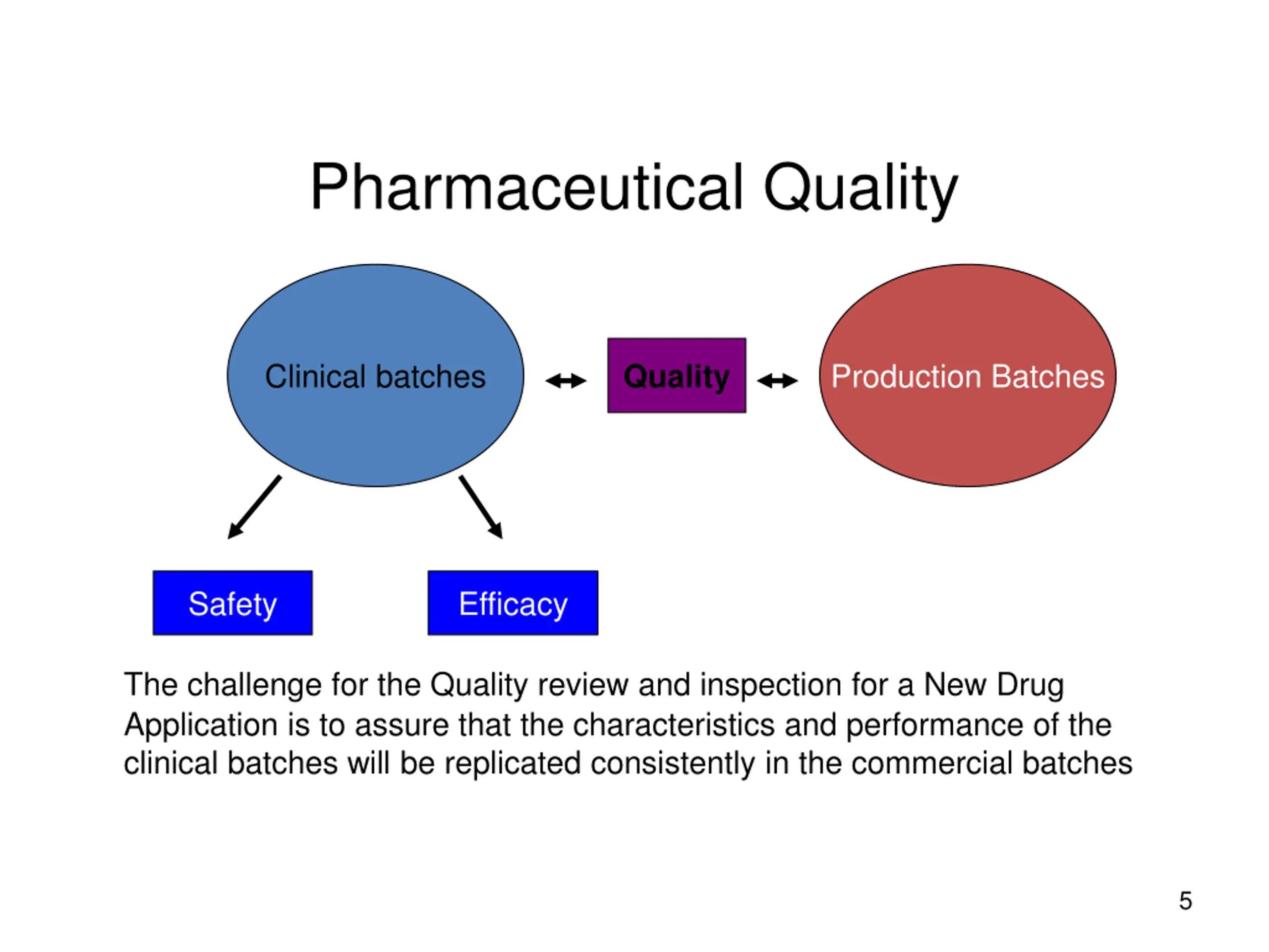 Pharmaceutical Quality Clinical batches Production Batches Quality Safety Efficacy The challenge for the Quality review and inspection for a New Drug Application is to assure that the characteristics and performance of the clinical batches will be replicated consistently in the commercial batches 5