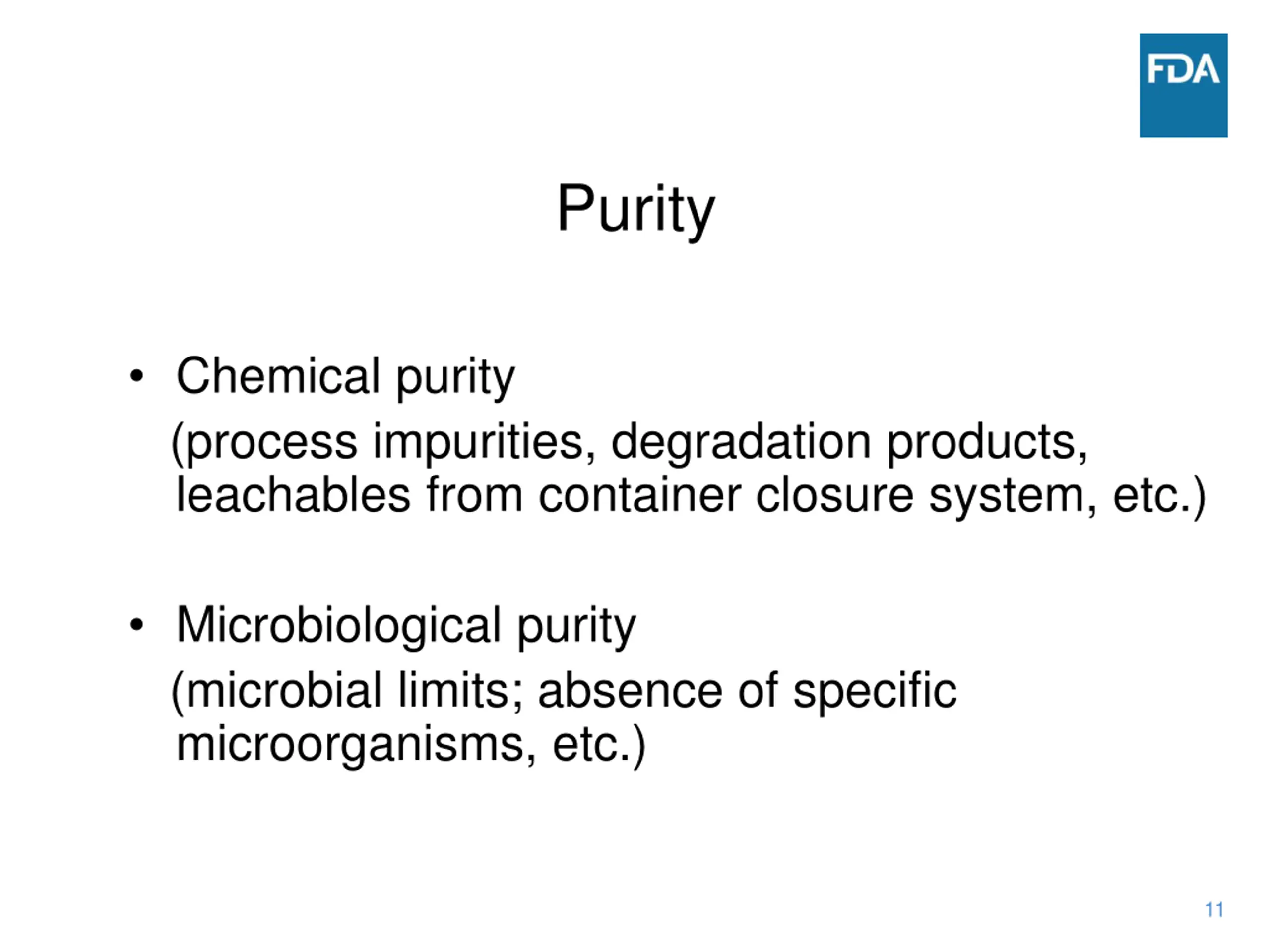 Purity Chemical purity (process impurities, degradation products, leachables from container closure system, etc.) Microbiological purity (microbial limits; absence of specific microorganisms, etc.) 11
