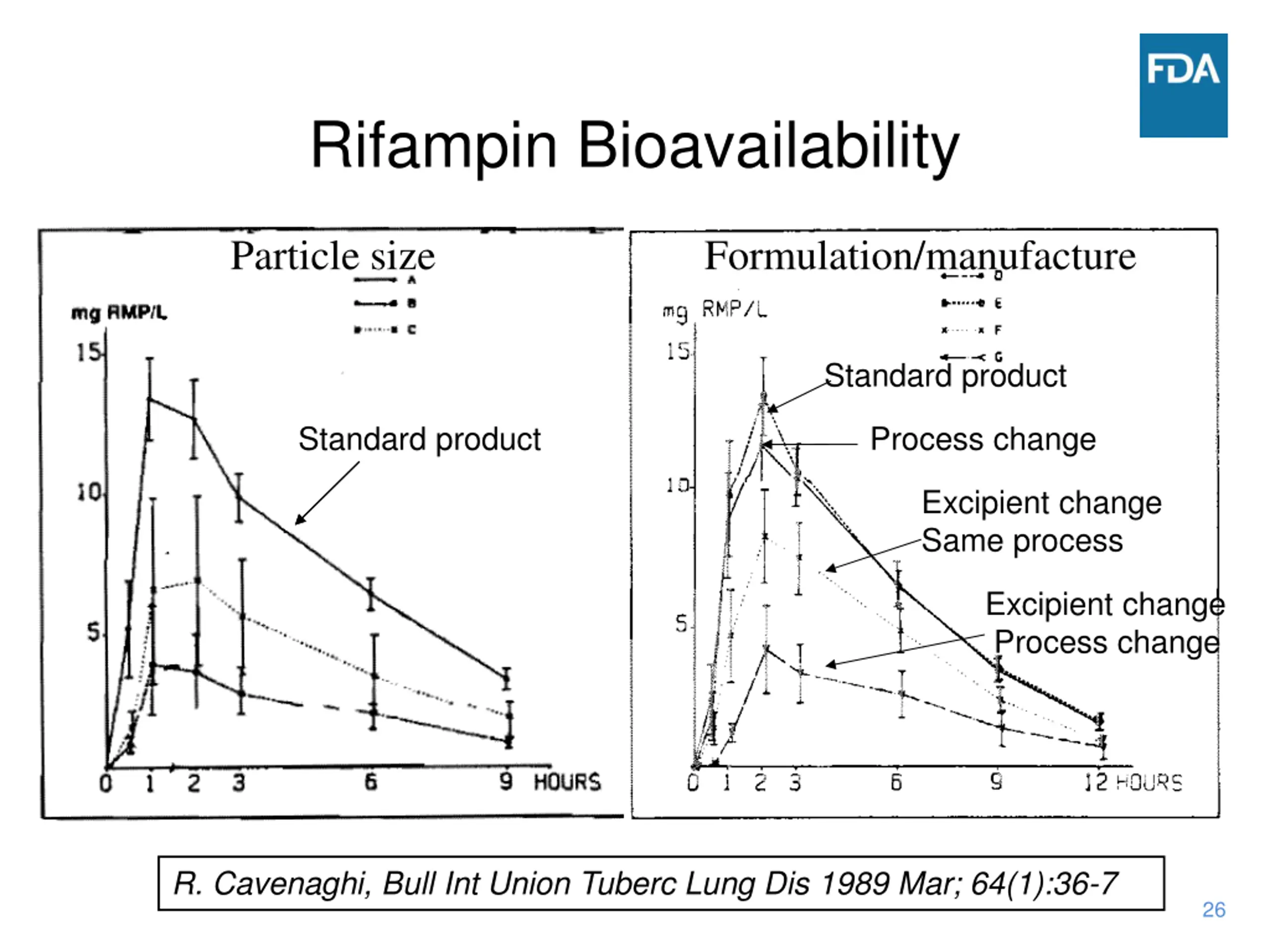 Rifampin Bioavailability Particle size Formulation/manufacture Standard product Standard product Process change Excipient change Same process Excipient change Process change R. Cavenaghi, Bull Int Union Tuberc Lung Dis 1989 Mar; 64(1):36-7 26