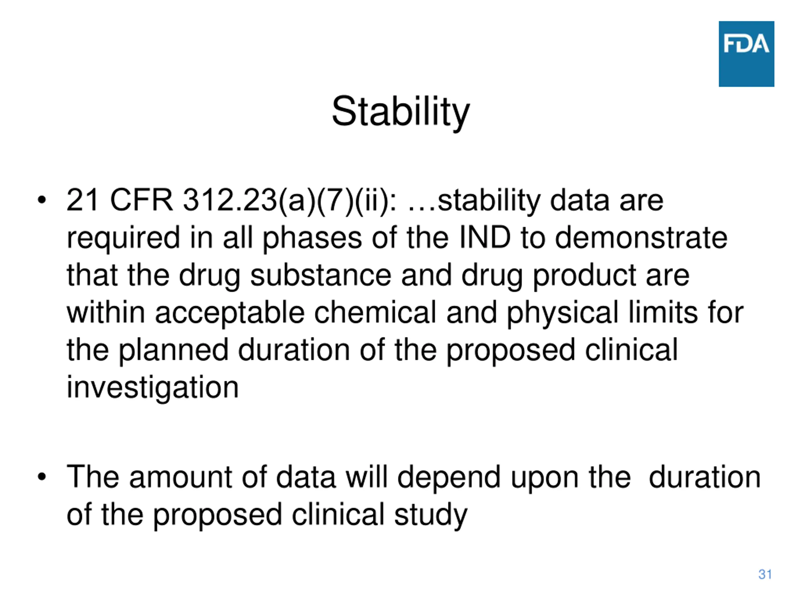 Stability 21 CFR 312.23(a)(7)(ii): stability data are required in all phases of the IND to demonstrate that the drug substance and drug product are within acceptable chemical and physical limits for the planned duration of the proposed clinical investigation The amount of data will depend upon the duration of the proposed clinical study 31
