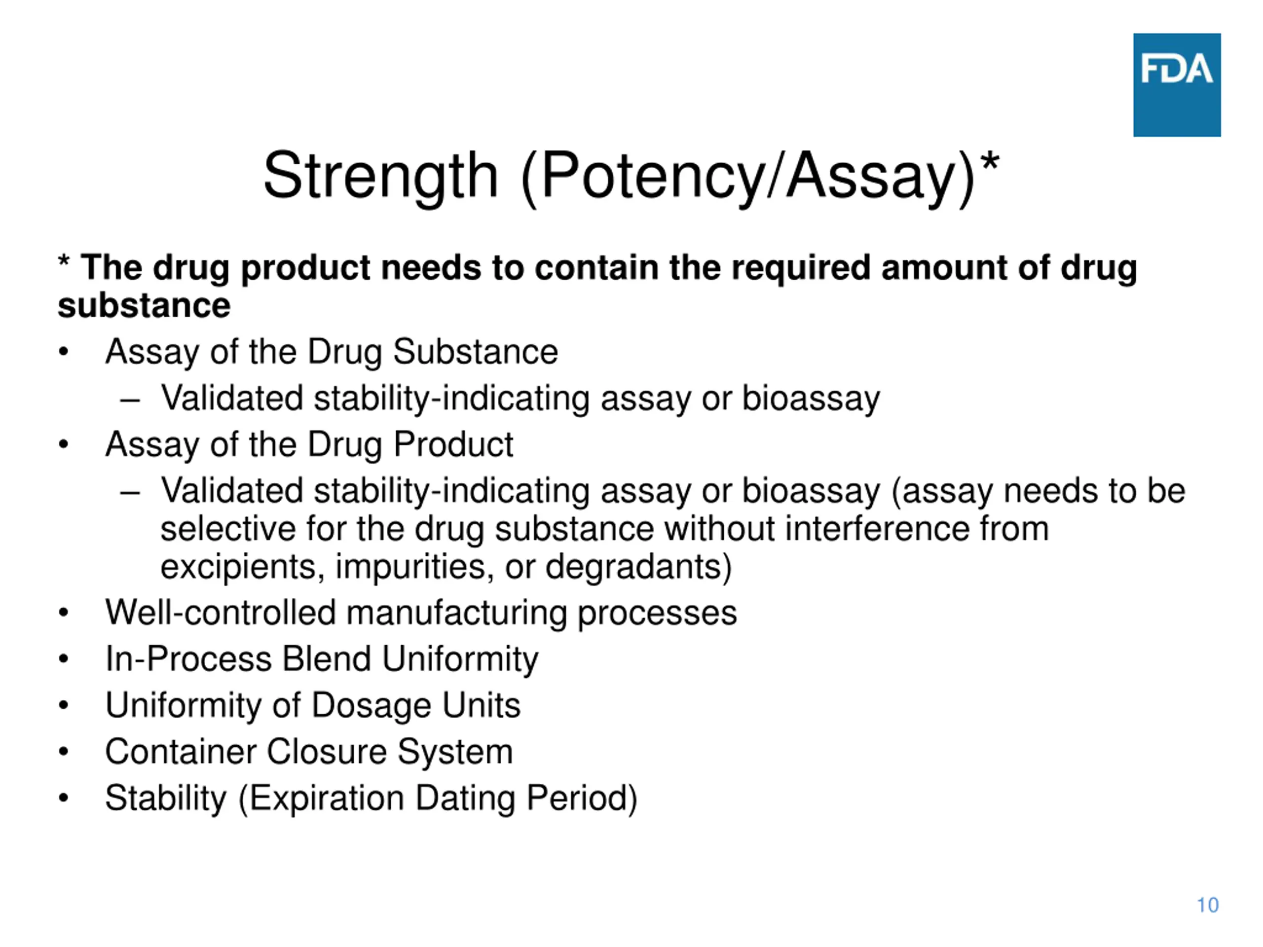 Strength (Potency/Assay)* * The drug product needs to contain the required amount of drug substance Assay of the Drug Substance Validated stability-indicating assay or bioassay Assay of the Drug Product Validated stability-indicating assay or bioassay (assay needs to be selective for the drug substance without interference from excipients, impurities, or degradants) Well-controlled manufacturing processes In-Process Blend Uniformity Uniformity of Dosage Units Container Closure System Stability (Expiration Dating Period) 10