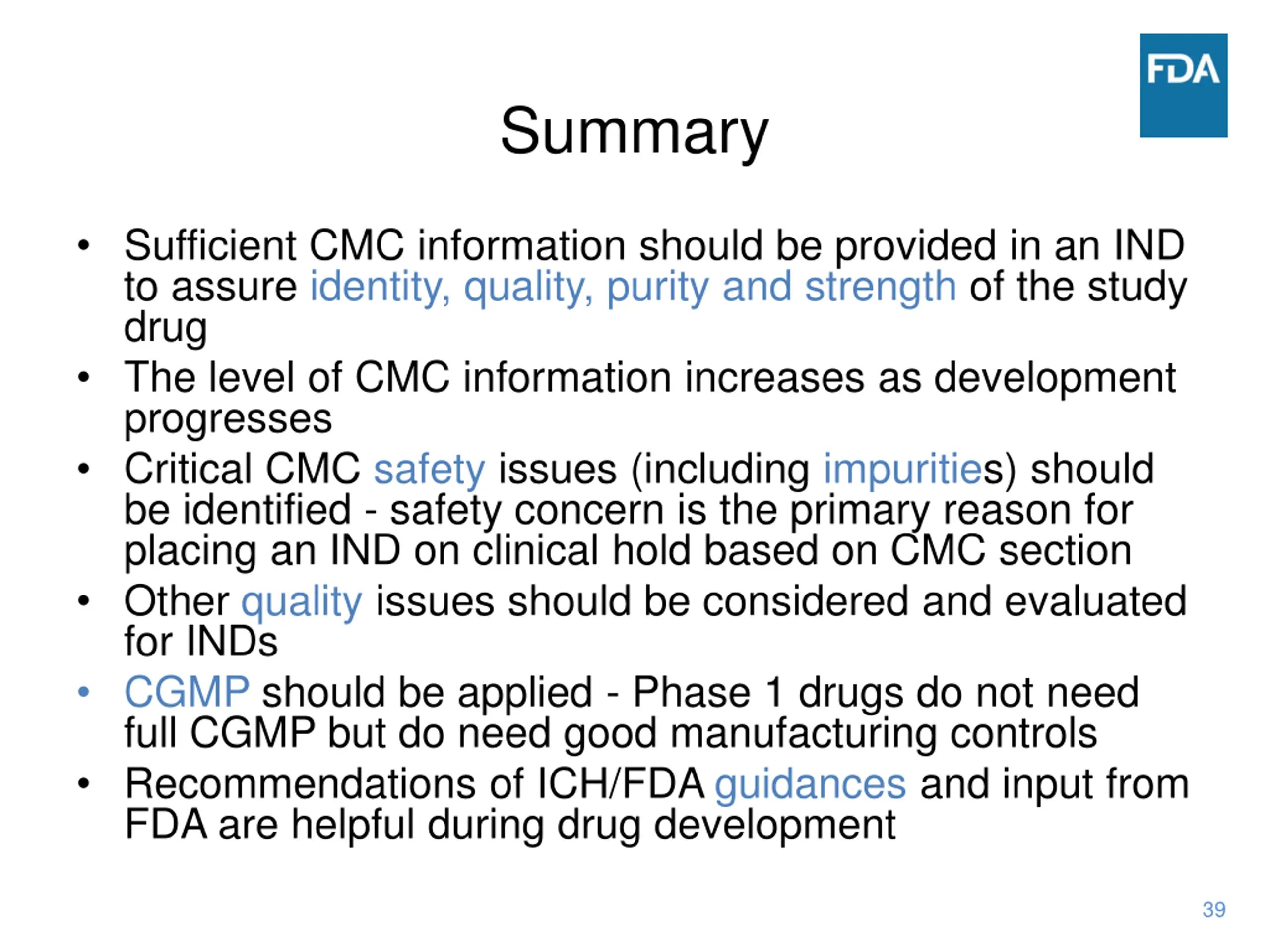 Summary Sufficient CMC information should be provided in an IND to assure identity, quality, purity and strength of the study drug The level of CMC information increases as development progresses Critical CMC safety issues (including impurities) should be identified - safety concern is the primary reason for placing an IND on clinical hold based on CMC section Other quality issues should be considered and evaluated for INDs CGMP should be applied - Phase 1 drugs do not need full CGMP but do need good manufacturing controls Recommendations of ICH/FDA guidances and input from FDA are helpful during drug development 39