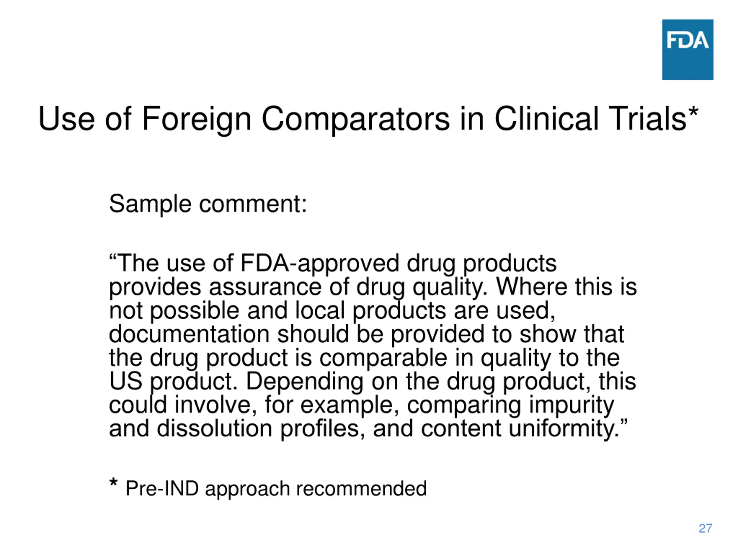Use of Foreign Comparators in Clinical Trials* Sample comment: The use of FDA-approved drug products provides assurance of drug quality. Where this is not possible and local products are used, documentation should be provided to show that the drug product is comparable in quality to the US product. Depending on the drug product, this could involve, for example, comparing impurity and dissolution profiles, and content uniformity. *Pre-IND approach recommended 27