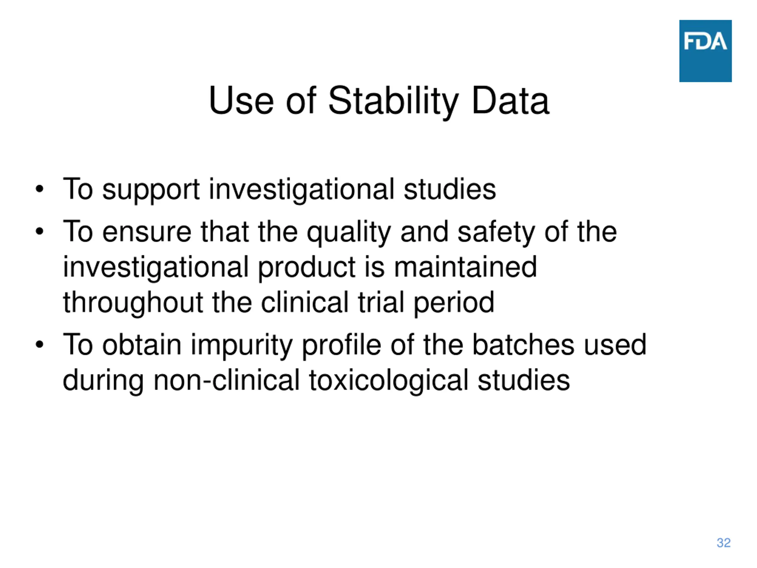 Use of Stability Data To support investigational studies To ensure that the quality and safety of the investigational product is maintained throughout the clinical trial period To obtain impurity profile of the batches used during non-clinical toxicological studies 32