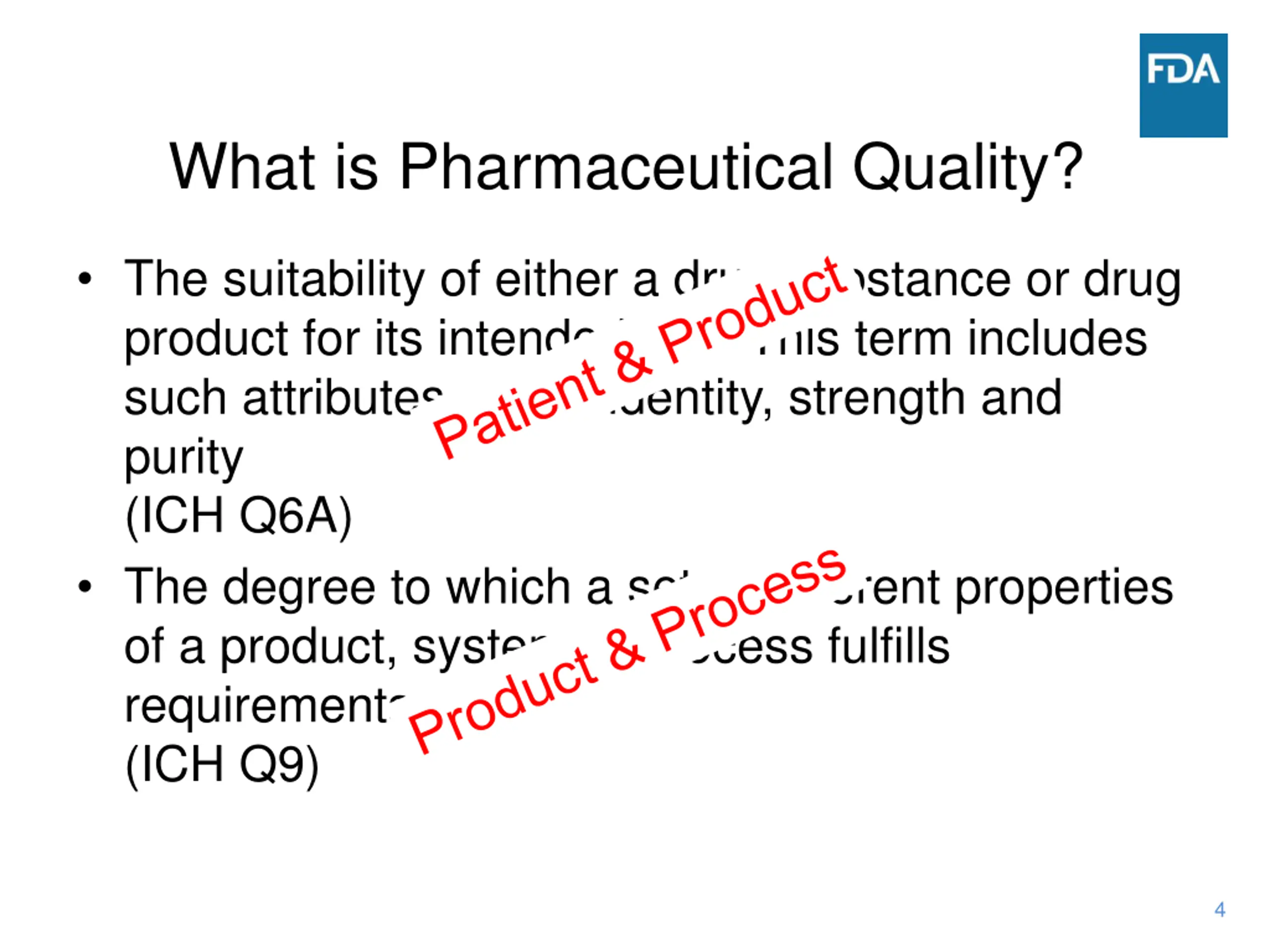 What is Pharmaceutical Quality? The suitability of either a drug substance or drug product for its intended use. This term includes such attributes as the identity, strength and purity (ICH Q6A) The degree to which a set of inherent properties of a product, system or process fulfills requirements (ICH Q9) 4