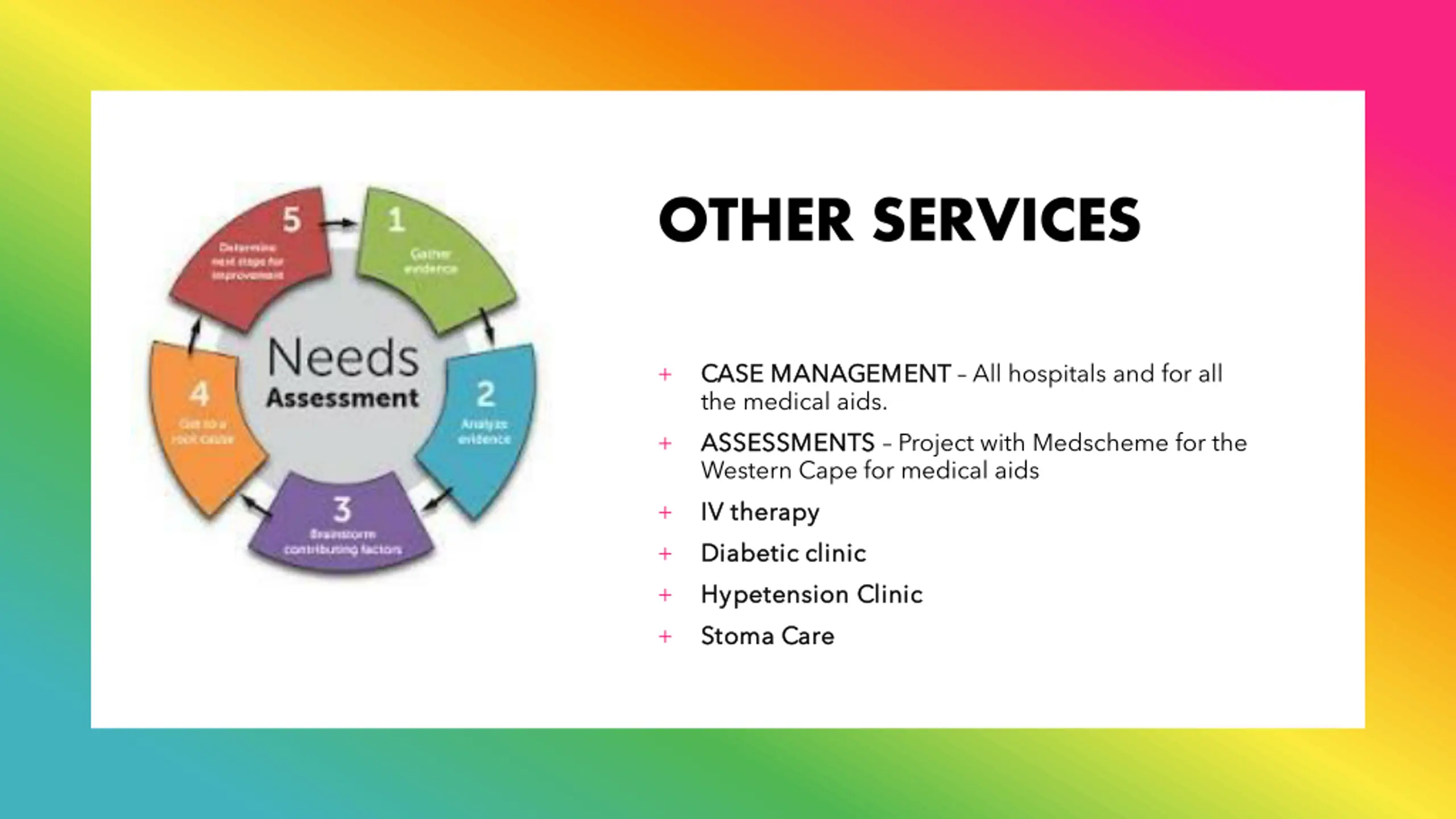 OTHER SERVICES + CASE MANAGEMENT CASE MANAGEMENT All hospitals and for all the medical aids. ASSESSMENTS ASSESSMENTS Project with Medscheme for the Western Cape for medical aids IV therapy IV therapy Diabetic clinic Diabetic clinic Hypetension Hypetension Clinic Clinic Stoma Care Stoma Care + + + + +