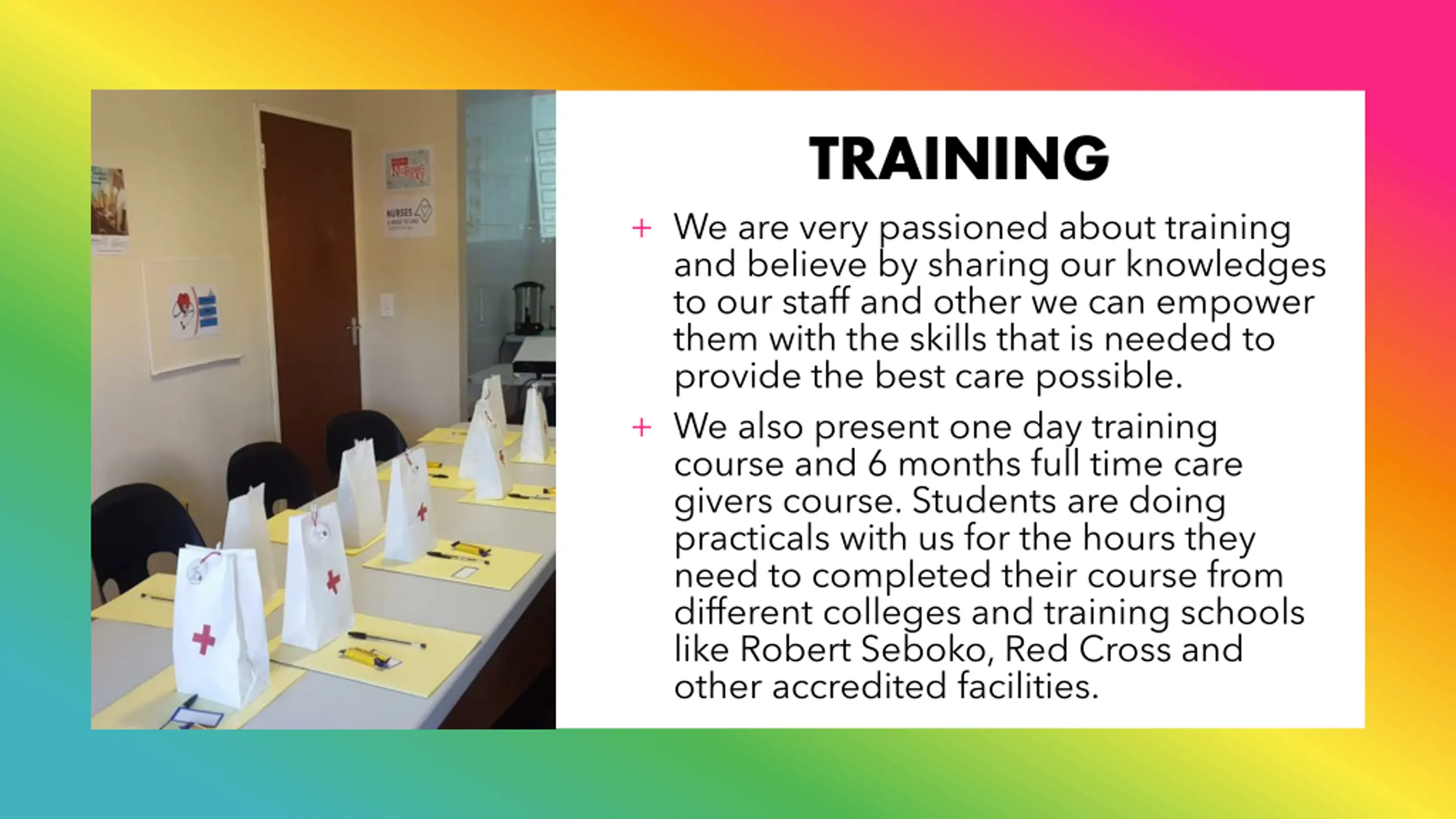 TRAINING + We are very passioned about training and believe by sharing our knowledges to our staff and other we can empower them with the skills that is needed to provide the best care possible. + We also present one day training course and 6 months full time care givers course. Students are doing practicals with us for the hours they need to completed their course from different colleges and training schools like Robert Seboko, Red Cross and other accredited facilities.