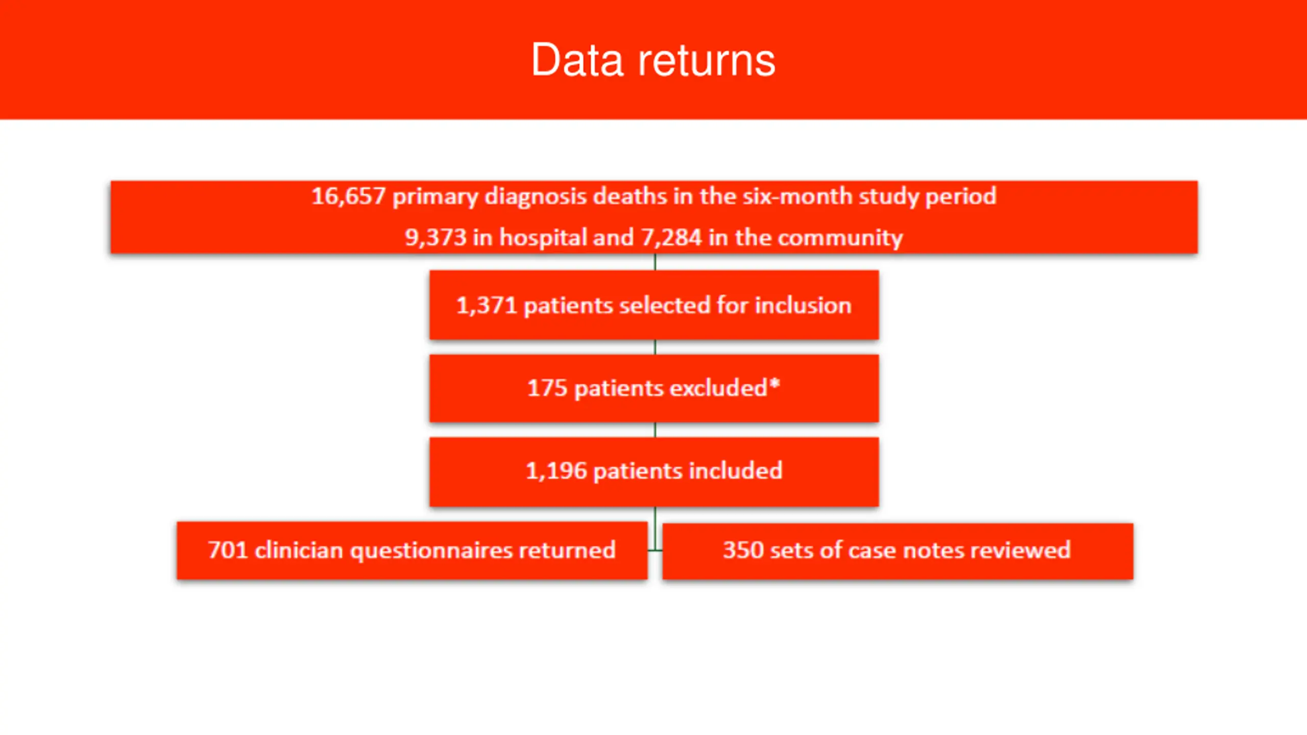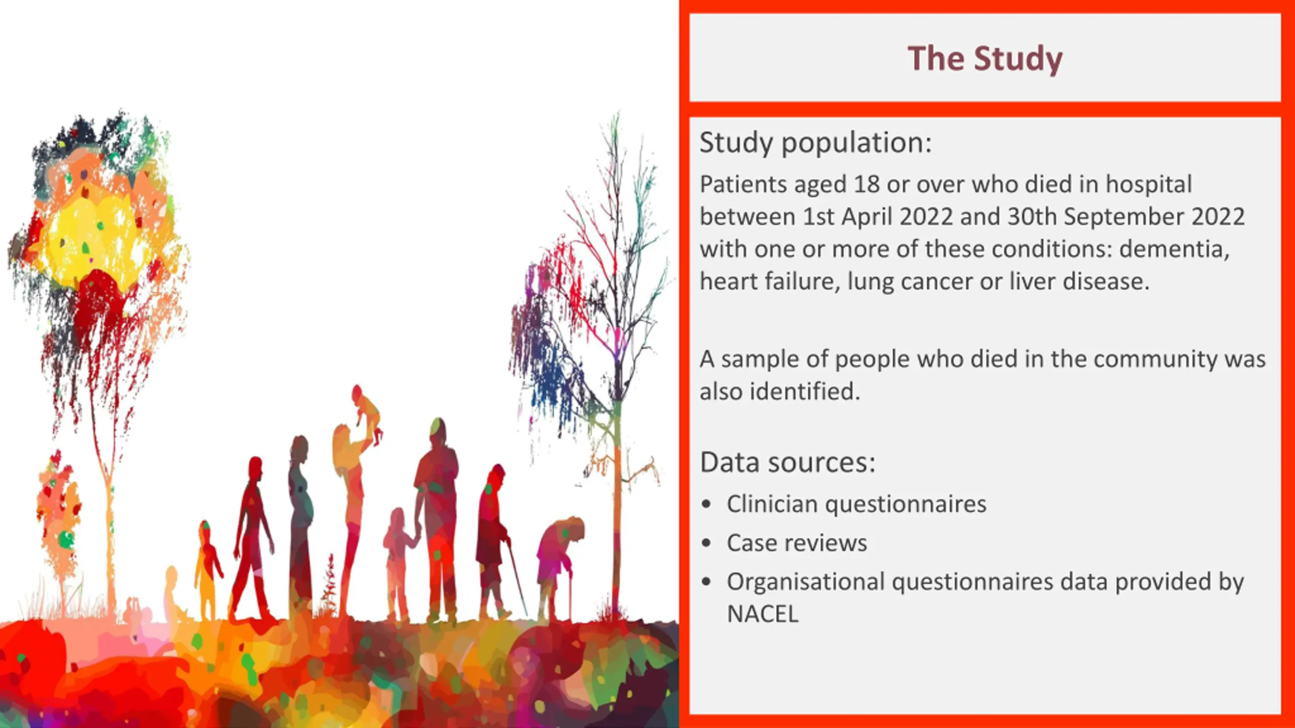 The Study Study population: Patients aged 18 or over who died in hospital between 1st April 2022 and 30th September 2022 with one or more of these conditions: dementia, heart failure, lung cancer or liver disease. A sample of people who died in the community was also identified. Data sources: Clinician questionnaires Case reviews Organisational questionnaires data provided by NACEL