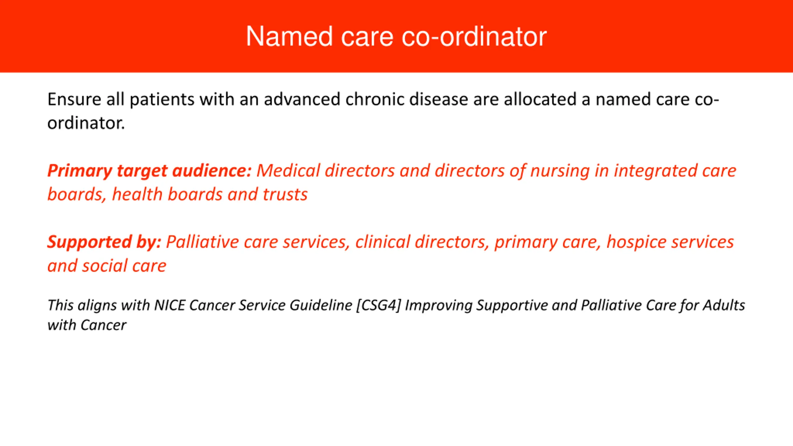 Named care co-ordinator Ensure all patients with an advanced chronic disease are allocated a named care co- ordinator. Primary target audience: Medical directors and directors of nursing in integrated care boards, health boards and trusts Supported by: Palliative care services, clinical directors, primary care, hospice services and social care This aligns with NICE Cancer Service Guideline [CSG4] Improving Supportive and Palliative Care for Adults with Cancer