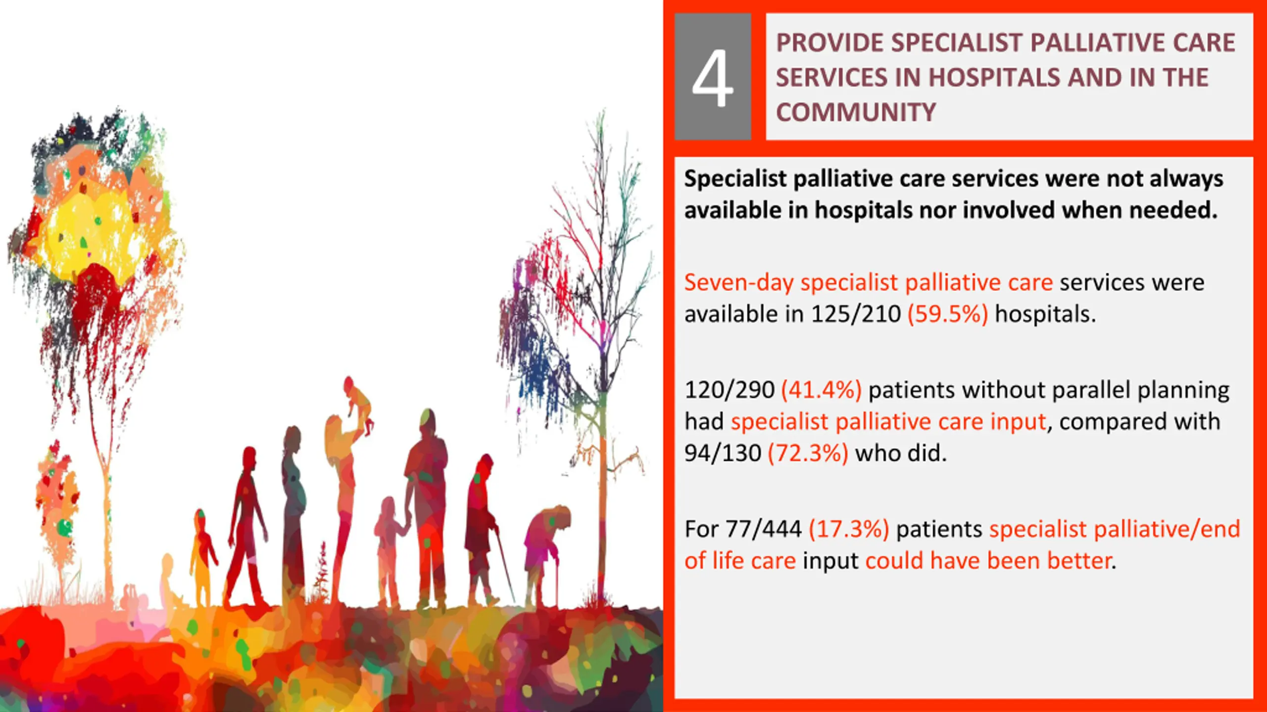 PROVIDE SPECIALIST PALLIATIVE CARE SERVICES IN HOSPITALS AND IN THE COMMUNITY 4 Specialist palliative care services were not always available in hospitals nor involved when needed. Seven-day specialist palliative care services were available in 125/210 (59.5%) hospitals. 120/290 (41.4%) patients without parallel planning had specialist palliative care input, compared with 94/130 (72.3%) who did. For 77/444 (17.3%) patients specialist palliative/end of life care input could have been better.
