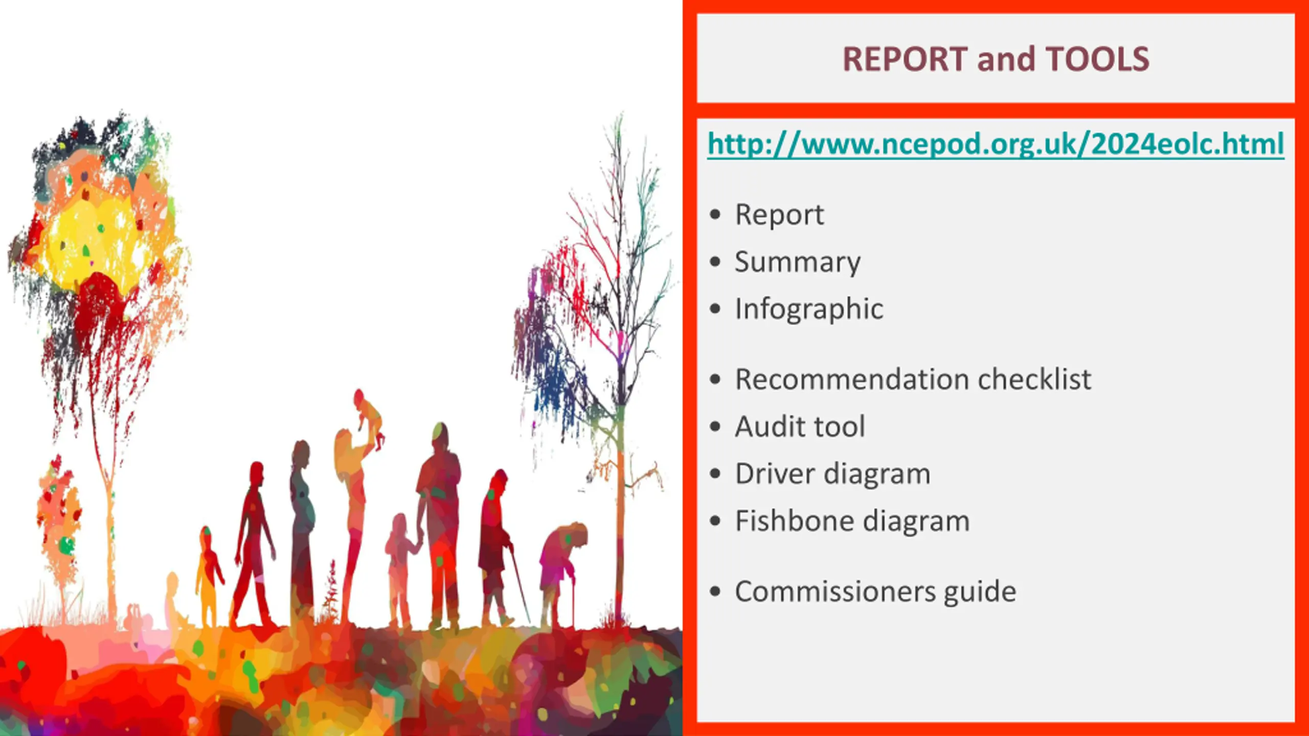 REPORT and TOOLS http://www.ncepod.org.uk/2024eolc.html Report Summary Infographic Recommendation checklist Audit tool Driver diagram Fishbone diagram Commissioners guide