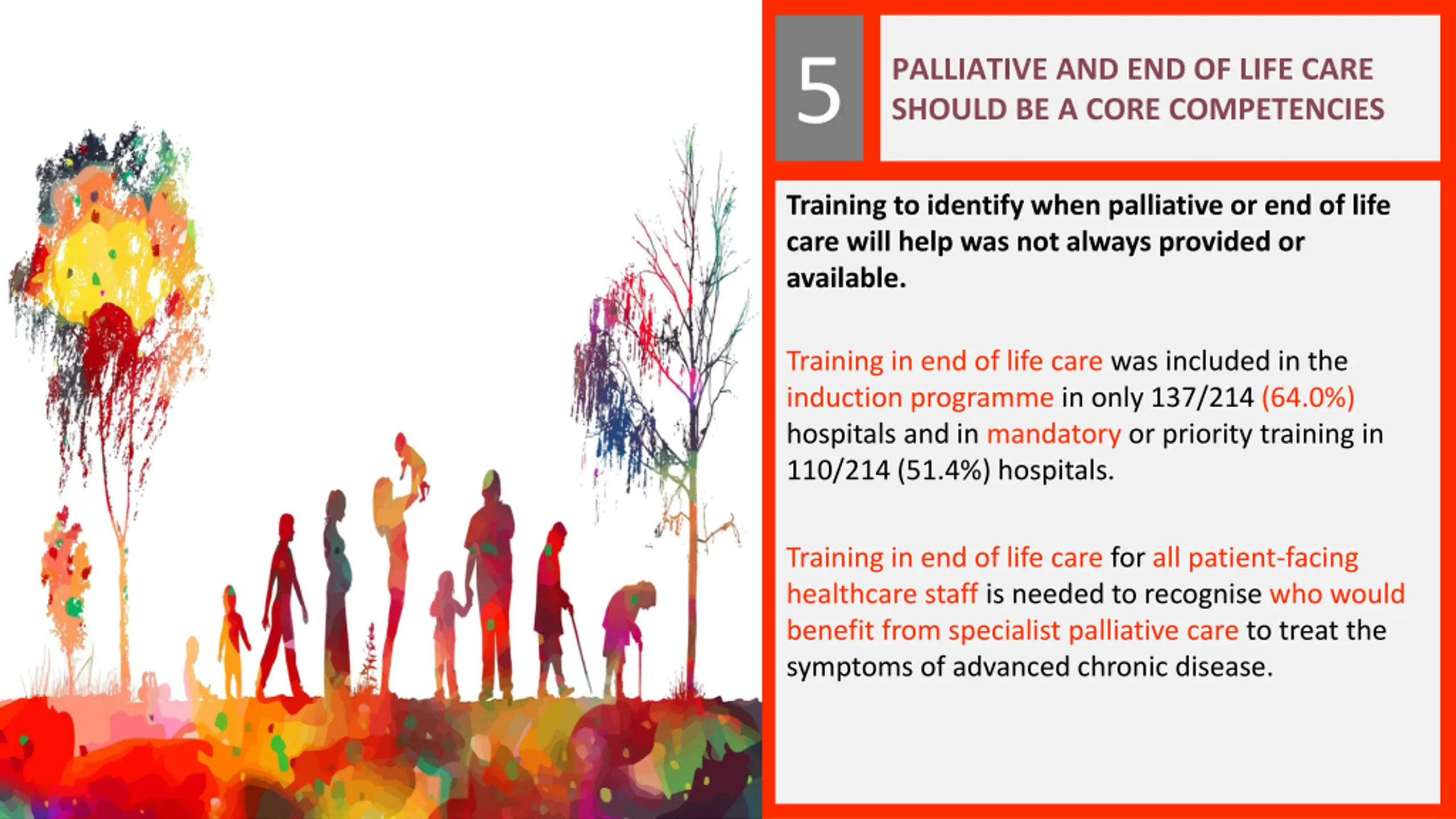 5 PALLIATIVE AND END OF LIFE CARE SHOULD BE A CORE COMPETENCIES Training to identify when palliative or end of life care will help was not always provided or available. Training in end of life care was included in the induction programme in only 137/214 (64.0%) hospitals and in mandatory or priority training in 110/214 (51.4%) hospitals. Training in end of life care for all patient-facing healthcare staff is needed to recognise who would benefit from specialist palliative care to treat the symptoms of advanced chronic disease.