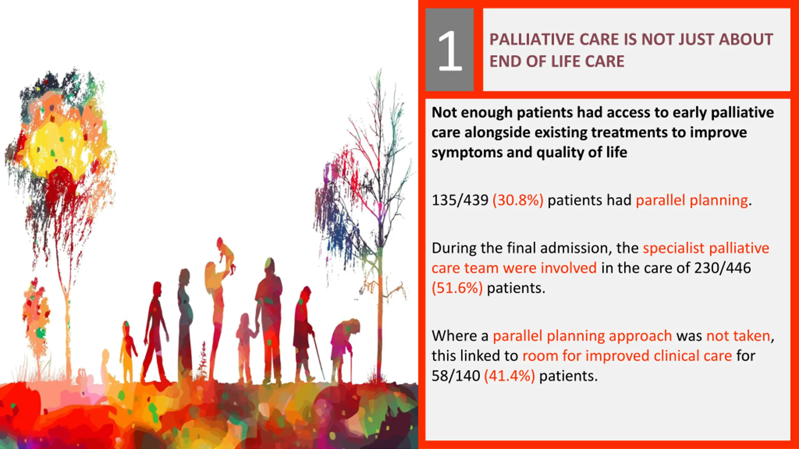 1 PALLIATIVE CARE IS NOT JUST ABOUT END OF LIFE CARE Not enough patients had access to early palliative care alongside existing treatments to improve symptoms and quality of life 135/439 (30.8%) patients had parallel planning. During the final admission, the specialist palliative care team were involved in the care of 230/446 (51.6%) patients. Where a parallel planning approach was not taken, this linked to room for improved clinical care for 58/140 (41.4%) patients.