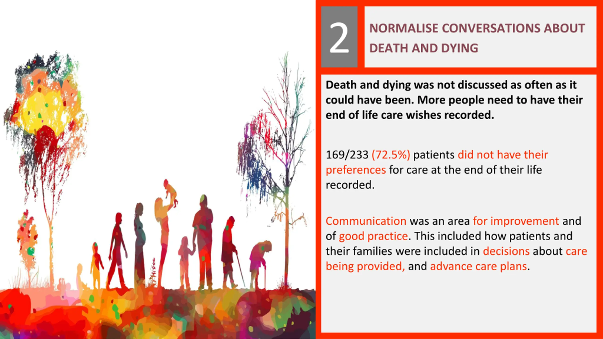 2 NORMALISE CONVERSATIONS ABOUT DEATH AND DYING Death and dying was not discussed as often as it could have been. More people need to have their end of life care wishes recorded. 169/233 (72.5%) patients did not have their preferences for care at the end of their life recorded. Communication was an area for improvement and of good practice. This included how patients and their families were included in decisions about care being provided, and advance care plans.