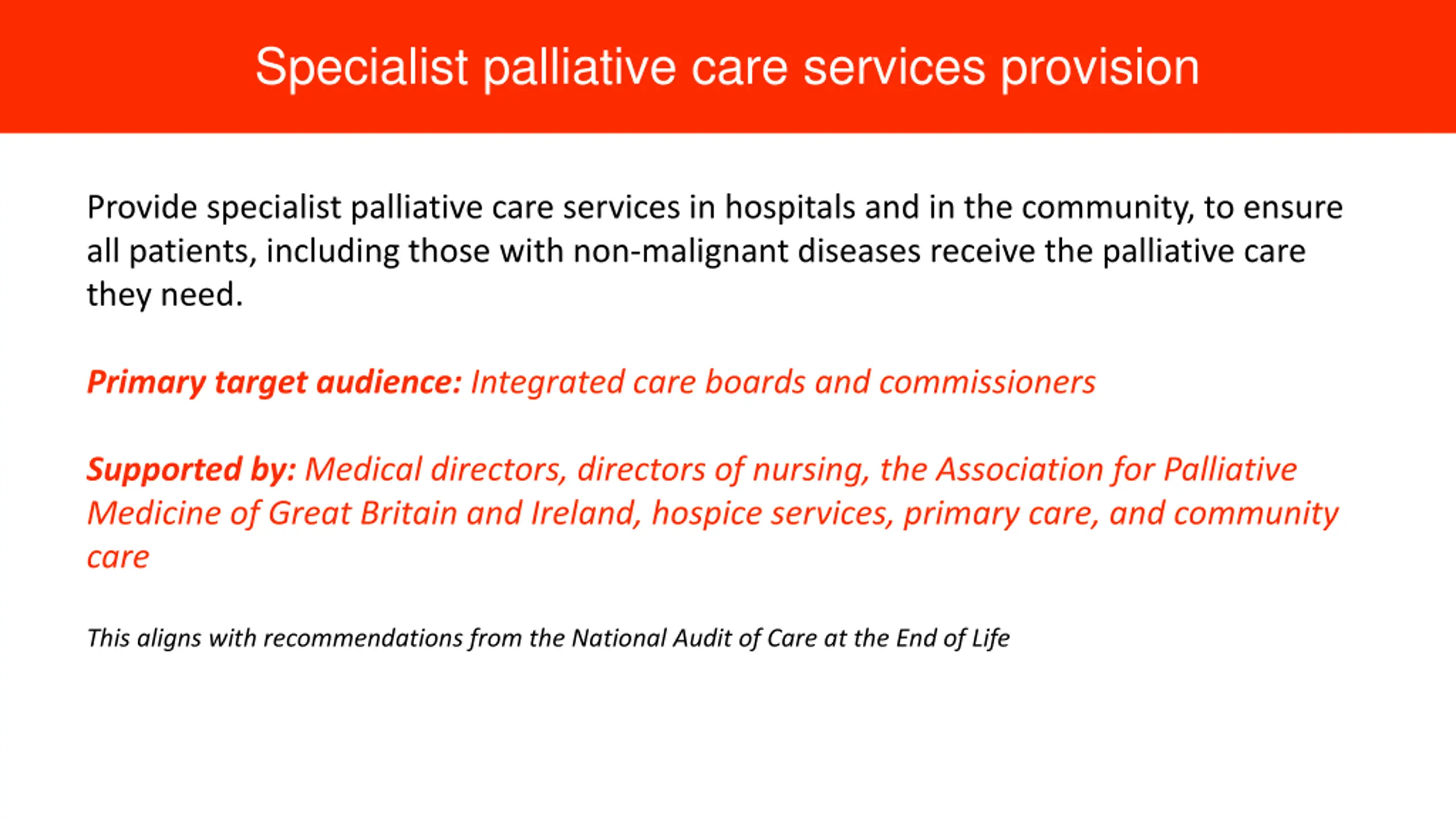 Specialist palliative care services provision Provide specialist palliative care services in hospitals and in the community, to ensure all patients, including those with non-malignant diseases receive the palliative care they need. Primary target audience: Integrated care boards and commissioners Supported by: Medical directors, directors of nursing, the Association for Palliative Medicine of Great Britain and Ireland, hospice services, primary care, and community care This aligns with recommendations from the National Audit of Care at the End of Life
