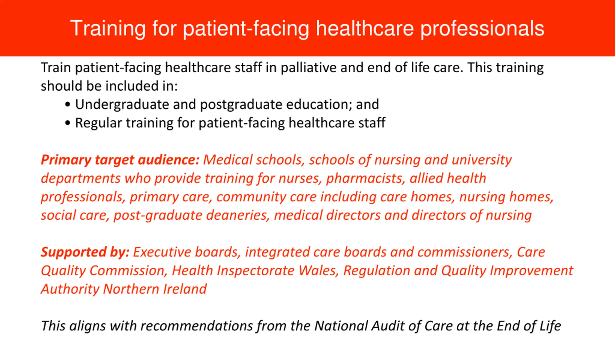 Training for patient-facing healthcare professionals Train patient-facing healthcare staff in palliative and end of life care. This training should be included in: Undergraduate and postgraduate education; and Regular training for patient-facing healthcare staff Primary target audience: Medical schools, schools of nursing and university departments who provide training for nurses, pharmacists, allied health professionals, primary care, community care including care homes, nursing homes, social care, post-graduate deaneries, medical directors and directors of nursing Supported by: Executive boards, integrated care boards and commissioners, Care Quality Commission, Health Inspectorate Wales, Regulation and Quality Improvement Authority Northern Ireland This aligns with recommendations from the National Audit of Care at the End of Life