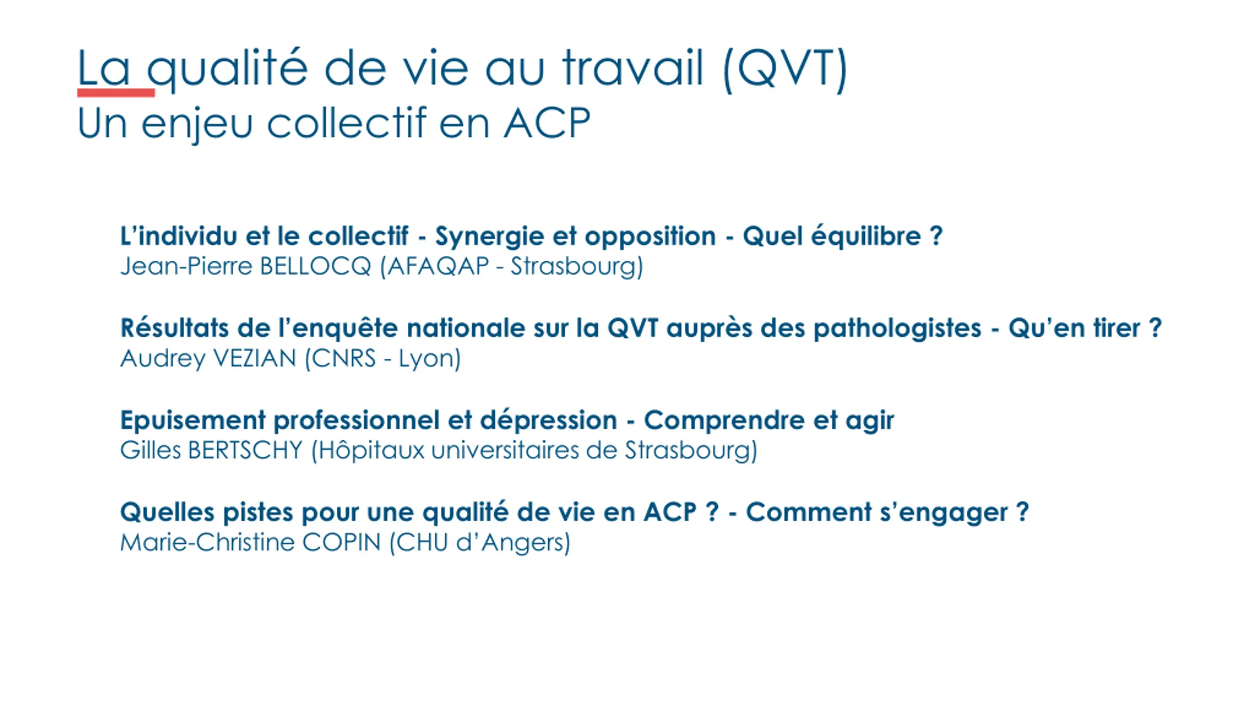 La qualit de vie au travail (QVT) Un enjeu collectif en ACP L individu et le collectif - Synergie et opposition - Quel quilibre ? Jean-Pierre BELLOCQ (AFAQAP - Strasbourg) R sultats de l enqu te nationale sur la QVT aupr s des pathologistes - Qu en tirer ? Audrey VEZIAN (CNRS - Lyon) Epuisement professionnel et d pression - Comprendre et agir Gilles BERTSCHY (H pitaux universitaires de Strasbourg) Quelles pistes pour une qualit de vie en ACP ? - Comment s engager ? Marie-Christine COPIN (CHU d Angers)